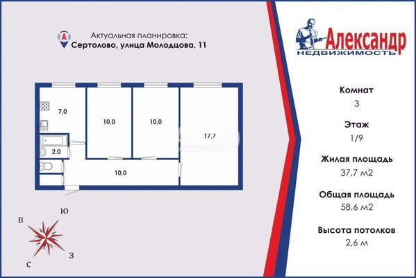 - Общая площадь 58.6 м²