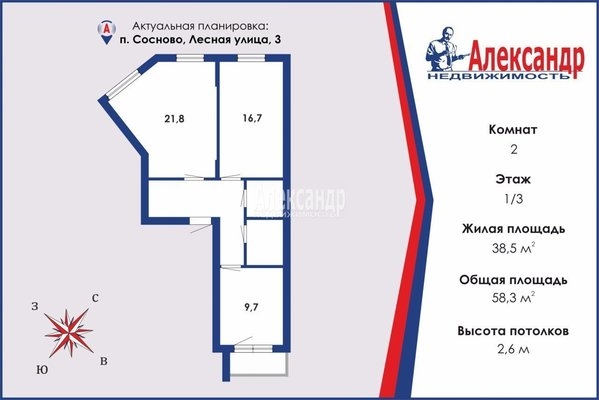 1697662 Уважаемые покупатели, предлагаем вам приобрести просторную двухкомнатную квартиру площадью 58,3 кв.м. в п. Сосново Приозерского района. Квартира не угловая, тёплая и светлая, расположена на первом этаже трёхэтажного жилого дома 2022 года постройки.