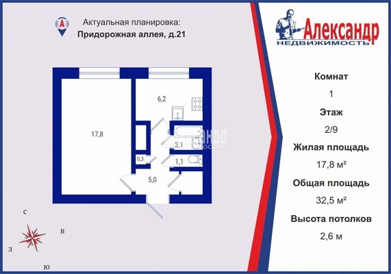 - Общая площадь 32.5 м²