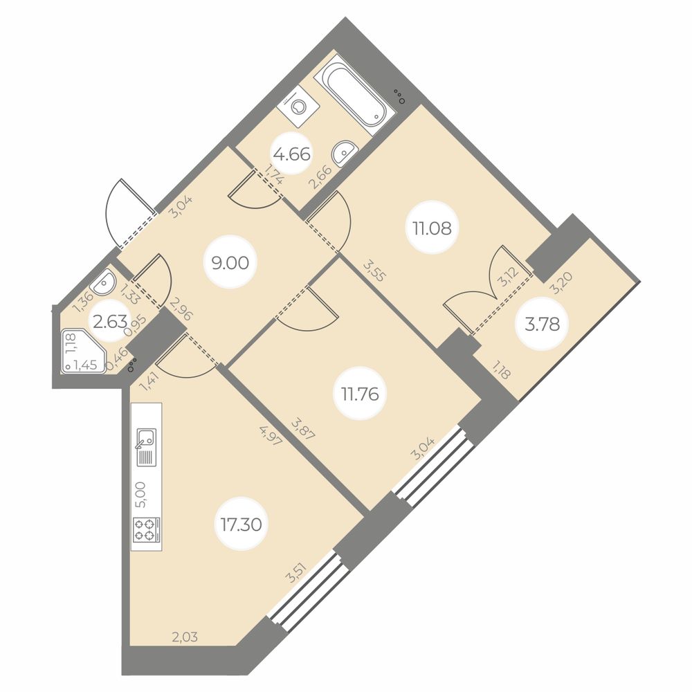 - Площадь кухни 17.3 м²