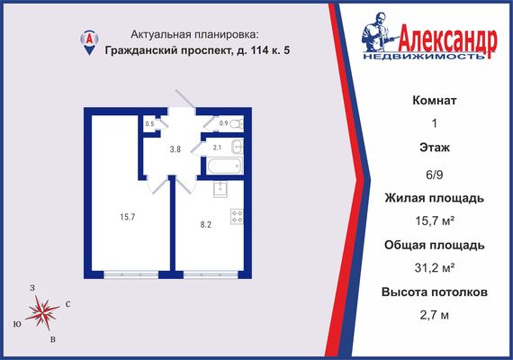 - Общая площадь 31.2 м²