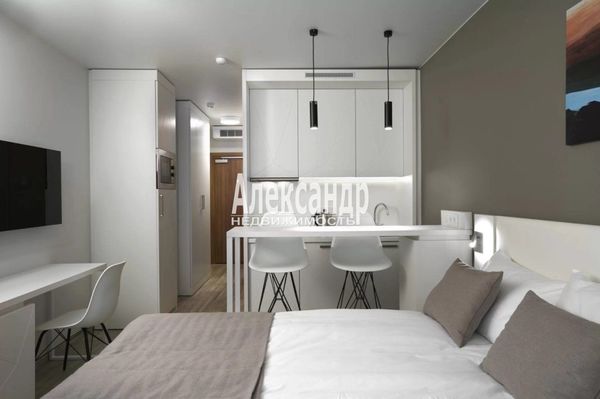 Студия укомплектована современной кухней, бытовой техникой (посудомоечная машина, стиральная машина) и мебелью.