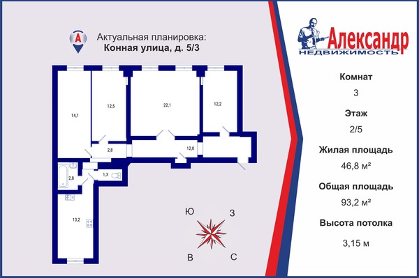 - Жилая площадь 46.8 м²