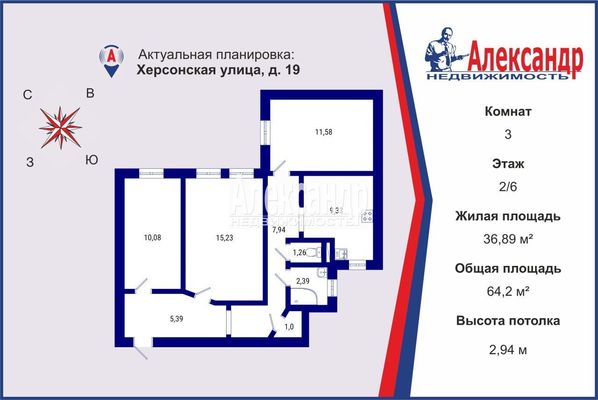 - площадь комнат 36.89=10,08+15,23+11,58 кв.м.;