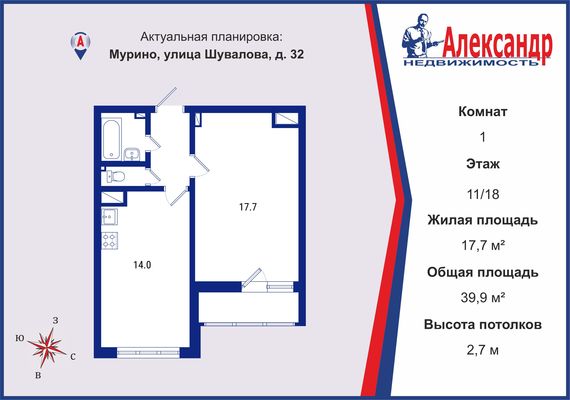 Просторная евродвушка общей площадью 39,9 кв. м на 11 этаже;
