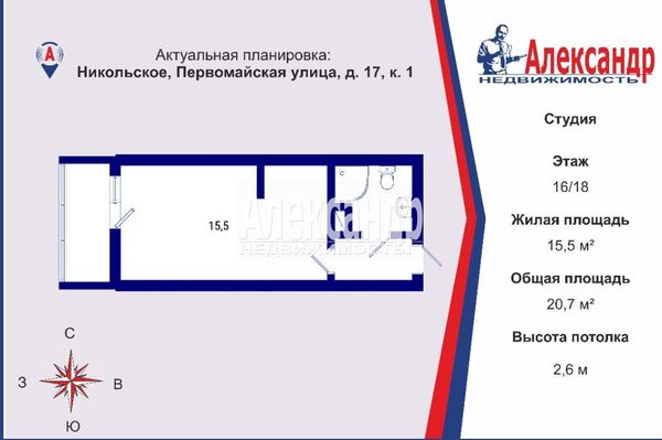 1703308 Прoдaм квартиру-студию с лоджией в г. Никoльcкoе, Тосненского р-на.