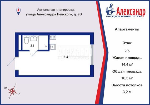 - Общая площадь 16.5 м²
