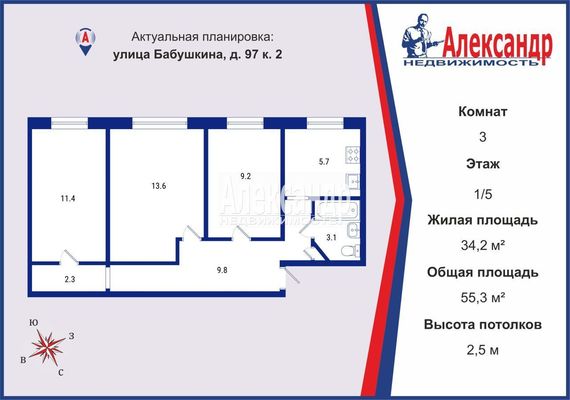 Изолированные комнаты: 13,6 кв.м.+11,4 кв.м.+9.2 кв.м. Кухня 5,7 кв.м., коридор 9,8 кв.м., совмещенный санузел 3,1 кв.м., шкаф 0,2 кв.м.