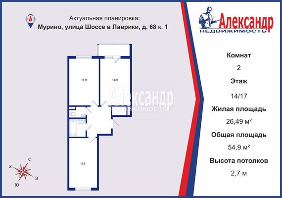 1703563 Вашему вниманию! Продается отличная 2-комнатная квартира по адресу: г. Мурино, ул. Шоссе в Лаврики, д. 68, к. 1.