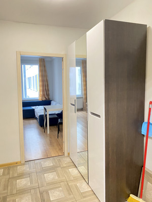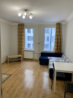 Все необходимое в наличии. Отличное состояние, бытовая техника (холодильник, варочная панель, СВЧ-печь, вытяжка, стиральная машина, утюг и т. д). Мебель: кровать, диван, стол, стулья, журнальный столик, стеллажи, шкаф, вешалка в прихожей).