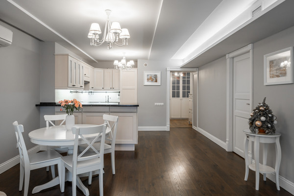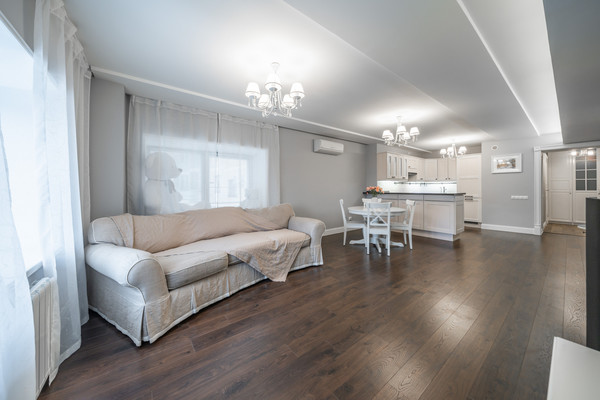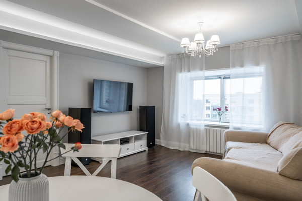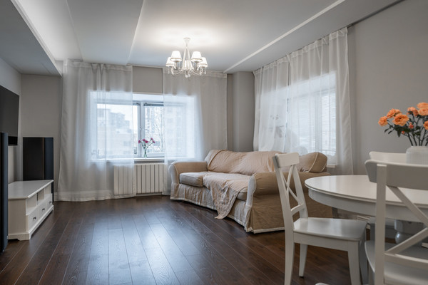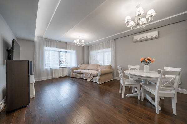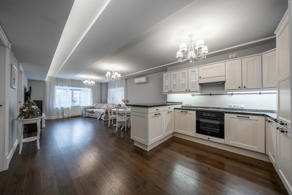 Все выполнено из стильных и качественных материалов в мягких тонах, приятное освещение, эргономичное планирование пространства.По материалам: деревянные стеклопакеты, ламинат высокой прочности, моющиеся обои. Имеется вся необходимая бытовая техника: посудомоечная машина BOSCH, варочная панель, духовой шкаф, встроенный холодильник, стиральная машина. Кухонный гарнитур производства ИКЕА. В гостиной установлен кондиционер.