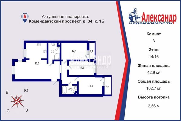 - Квартира общей площадью 109,6 кв. м. Три отдельные комнаты: кабинет14,3 кв. м (плюс лоджия 3,4 кв. м), комната 14,4 кв. м (плюс лоджия 3,5 кв. м) и спальня 14,2 кв. м. Кухня -гостиная 33 кв. м с привлекательным видом на просторы Комендантского проспекта. Большая прихожая, коридор. Два просторных санузла: в одном установлена душевая кабина, во втором ванна.