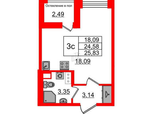Идеальное планировочное решение: Каждый метр площади использован с максимальной эффективностью. Даже на 24.59 кв. м вы сможете комфортно разместить все необходимое: зону для сна, гостиную и кухню.