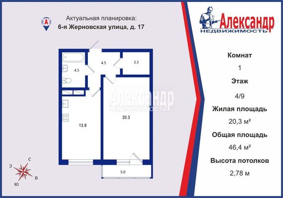 1704725 Вашему внимание предлагается большая однокомнатная квартира в Красногвардейском районе Санкт-Петербурга!