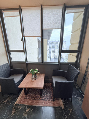 +На лоджии создан отдельный уголок отдыха с видом на Неву. Комплект садовой мебели, жалюзи, мягкое освещение и розетки. Все хозяйственные мелочи спрятаны в отдельном шкафу (пылесос, гладильная доска, утюг, сушилка для белья).