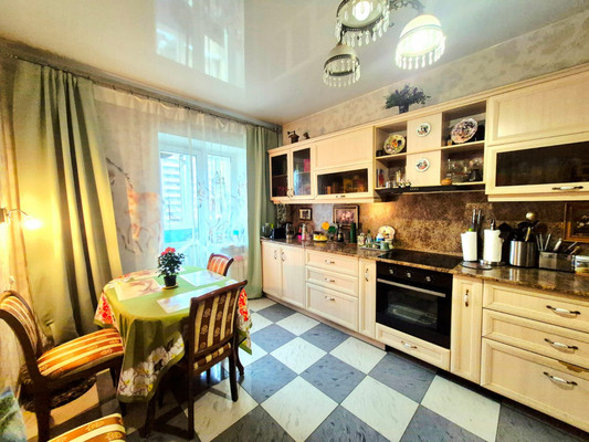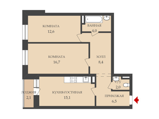Кухня – 15,1 кв. м, с выходом на застекленную лоджию– 2,1 кв. м;
