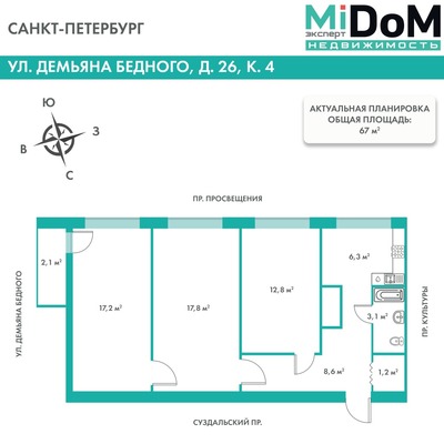 - Планировка: 2 изолированные спальни (17,2 и 12,8 кв. м), гостиная 17,8 кв. м, кухня 6,3 кв. м, гардеробная.