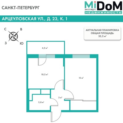 Квартира общей площадью 35,2 кв. м: 31 кв. м по ЕГРН + просторный застекленный балкон 4,2 кв. м. Наш квартирой только тех этаж, без соседей.