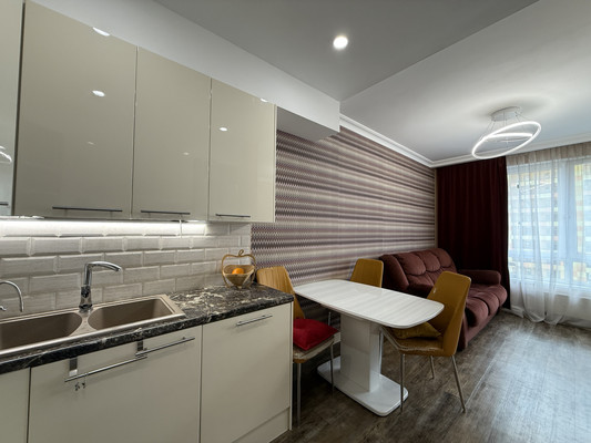 - В КУХНЕ-ГОСТИНОЙ располагается полноценный кухонный гарнитур, обеденная зона и зона гостиной.