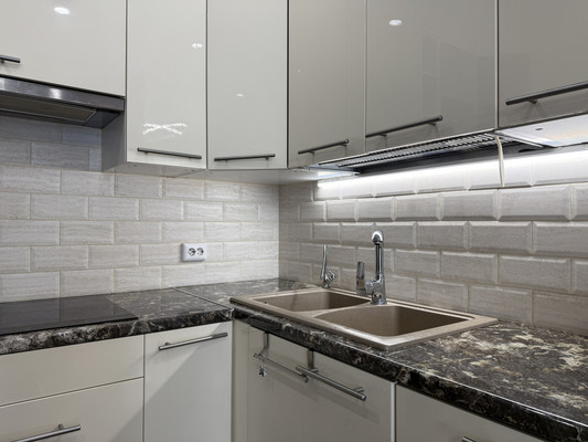 - В кухне функционален и продуман каждый метр, сделана удобная РАЗВОДКА электрики, есть вся необходимая ВСТРОЕННАЯ ТЕХНИКА.