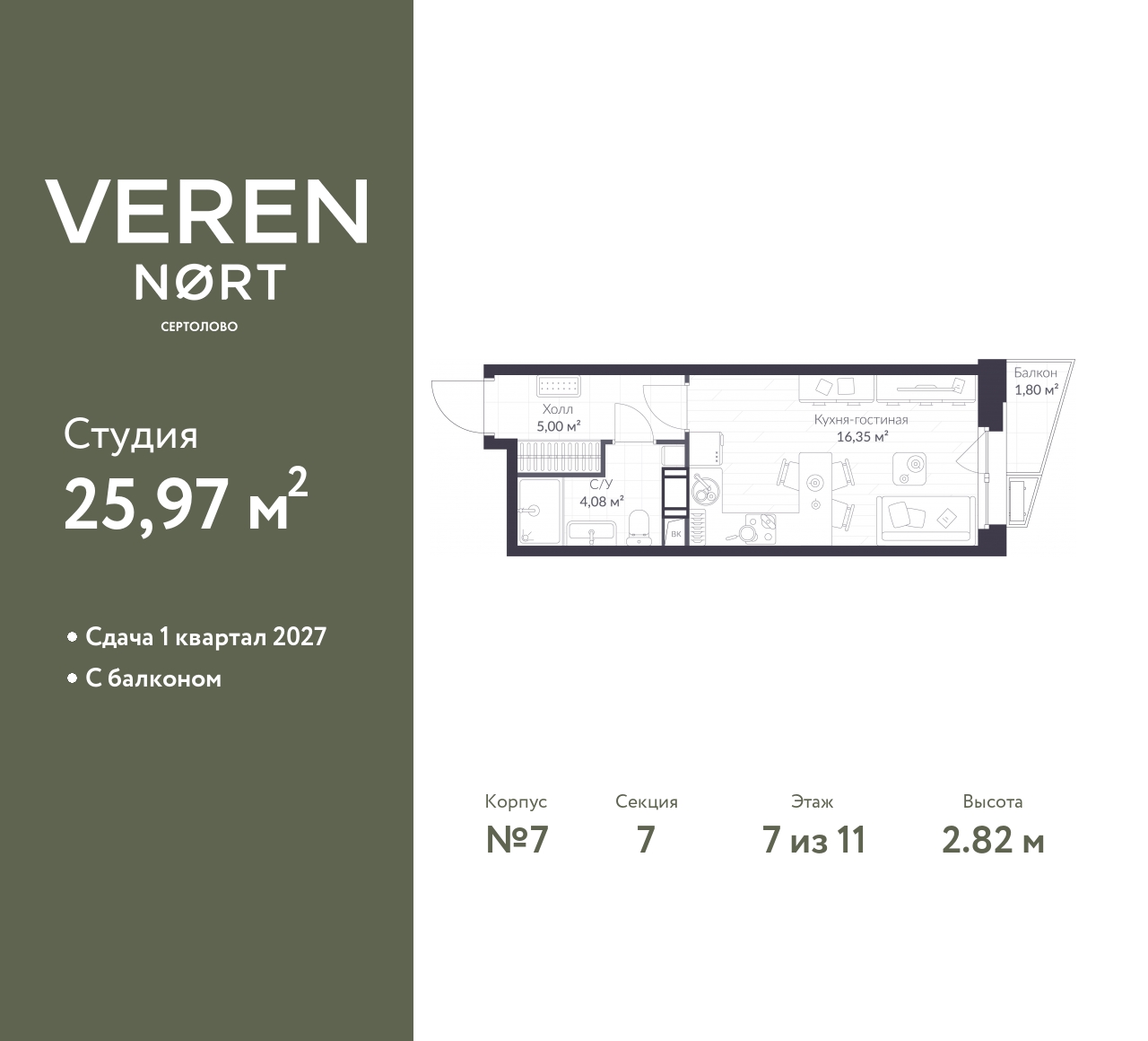 Успейте оформить бронирование по этой цене! Срок акции ограничен! Стоимость квартиры указана со скидкой, ваша экономия составит 494,276 RUB. По всем вопросам звоните в офис продаж, наши менеджеры вам все расскажут! Продается 1-комн. квартира-студия в Veren Nort Сертолово на 7 этаже. Квартира без отделки, после выдачи ключей можно делать ремонт. Общая площадь: 25.97 кв.м., площадь гостиной 16.34 кв.м., из которых 5 кв.м. выделено под кухонную зону. Все окна выходят на одну сторону. В квартире один балкон, один совмещенный санузел. Высота потолков 2.82 м. Квартира находится в корпусе 7. Дом монолитный, одноподъездный, высотой 11 этажей. На этаже 14 квартир. В подъезде 1 пассажирский и 1 грузовой лифт. Окончание строительства - 4 квартал 2026 года. Оформление сделки по договору долевого участия. С балконом, вид на приватный двор. Сочетание современной архитектуры и отличной экологии севера Лен. области. Выразительный облик домов разработан именитым архитектурным бюро «Остоженка». Характеристики жилого комплекса исключительны: продуманный ландшафтный дизайн, оригинальные парадные, разработанные по индивидуальному дизайн-проекту, современные детские и многофункциональные спортивные площадки, летний кинотеатр под открытым небом, два детских сада. Комплекс создается в уже сложившейся инфраструктуре г. Сертолово и обладает удобным транспортным сообщением с Санкт-Петербургом. В 300 метрах от «VEREN NORT сертолово» планируется транспортно-пересадочный узел «Сертолово», который обеспечит удобную железнодорожную связь с Финляндским вокзалом Санкт-Петербурга. (AQID02417943)