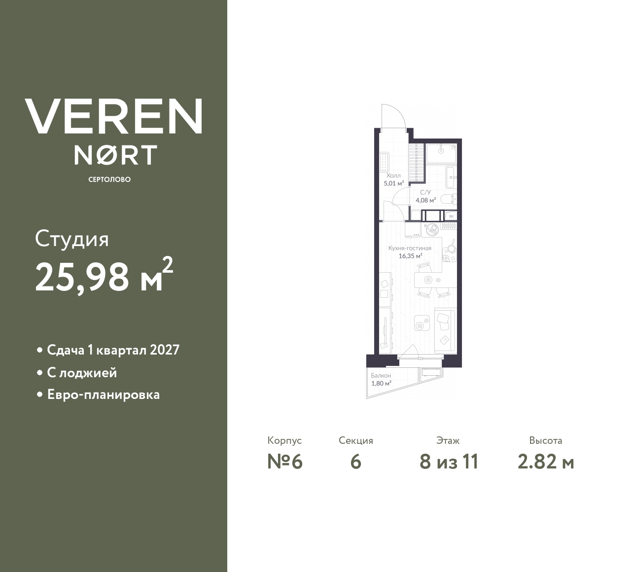 Торопитесь забронировать, пока действует скидка! Срок предложения ограничен! Стоимость квартиры указана со скидкой, ваша экономия составит 499,930 RUB. Звоните, мы вам все подробно расскажем! 1-комн. квартира-студия от застройщика в Veren Nort Сертолово на 8 этаже. Квартира без отделки, новый владелец может сделать ремонт по своему дизайн-проекту. Общая площадь: 25.98 кв.м., площадь гостиной 16.35 кв.м., из которых 5 кв.м. выделено под кухонную зону. Все окна выходят на одну сторону. В квартире один балкон, один совмещенный санузел. Высота потолков 2.82 м. Квартира находится в корпусе 6. Дом монолитный, одноподъездный, высотой 11 этажей. На этаже 14 квартир. В подъезде 1 пассажирский и 1 грузовой лифт. Окончание строительства - 4 квартал 2026 года. Оформление сделки по договору долевого участия. С балконом, вид на приватный двор. Сочетание современной архитектуры и отличной экологии севера Лен. области. Выразительный облик домов разработан именитым архитектурным бюро «Остоженка». Характеристики жилого комплекса исключительны: продуманный ландшафтный дизайн, оригинальные парадные, разработанные по индивидуальному дизайн-проекту, современные детские и многофункциональные спортивные площадки, летний кинотеатр под открытым небом, два детских сада. Комплекс создается в уже сложившейся инфраструктуре г. Сертолово и обладает удобным транспортным сообщением с Санкт-Петербургом. В 300 метрах от «VEREN NORT сертолово» планируется транспортно-пересадочный узел «Сертолово», который обеспечит удобную железнодорожную связь с Финляндским вокзалом Санкт-Петербурга. (AQID02417957)
