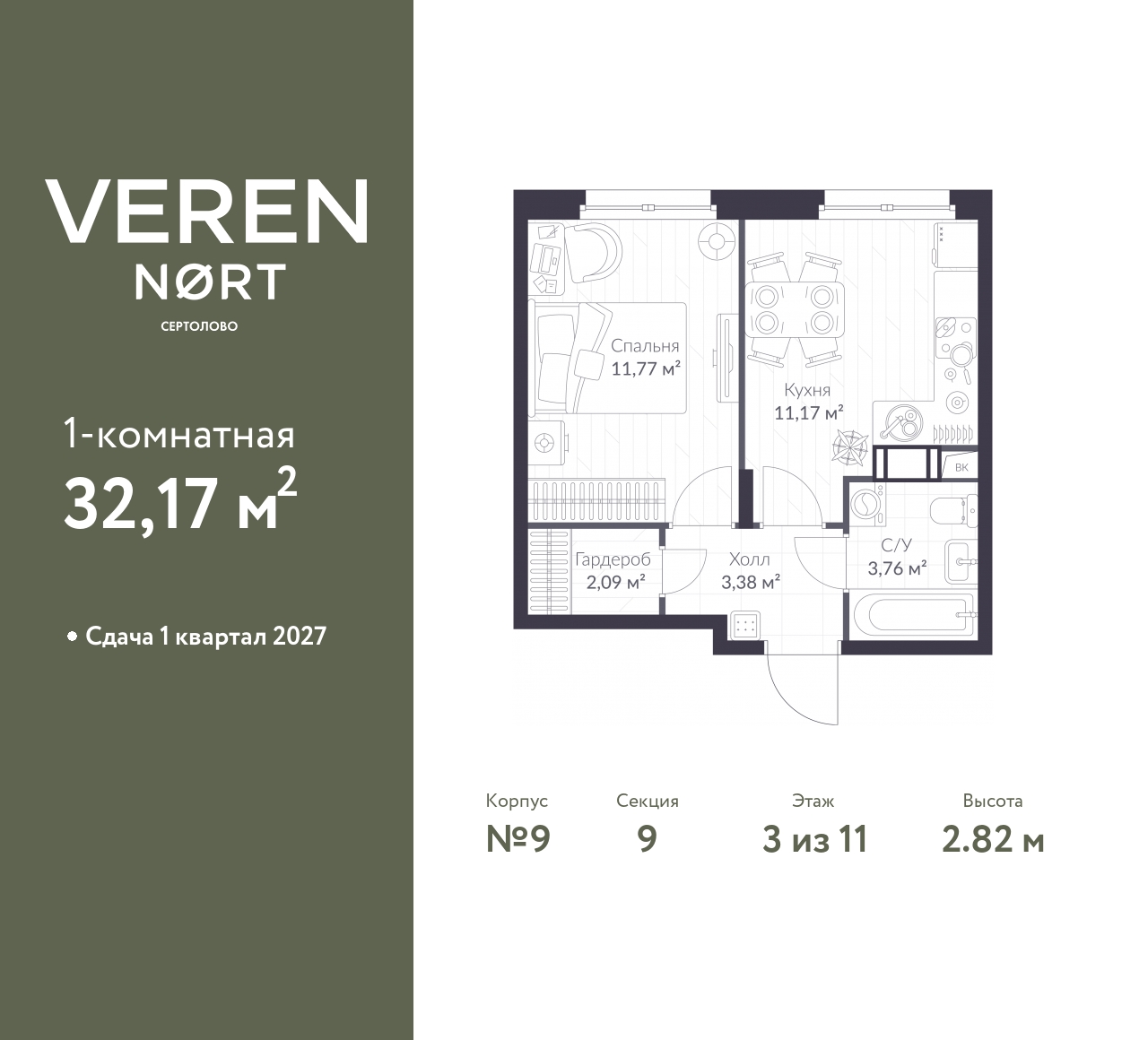 Успейте оформить бронирование на этих условиях! Срок акции ограничен! Стоимость квартиры указана со скидкой, ваша экономия составит 573,142 RUB. Звоните, мы вам все подробно расскажем! Продается 1-комн. квартира в Veren Nort Сертолово на 3 этаже. Квартира без отделки, новый собственник может сделать ремонт по своему дизайн-проекту. Общая площадь: 32.17 кв.м., жилая: 11.77 кв.м., площадь просторной куxни-гостиной: 11.17 кв.м. Все окна выходят на одну сторону. В квартире один совмещенный санузел. Высота потолков 2.82 м. Квартира находится в корпусе 9. Дом монолитный, одноподъездный, высотой 11 этажей. На этаже 14 квартир. В подъезде 1 пассажирский и 1 грузовой лифт. Окончание строительства - 4 квартал 2026 года. Оформление сделки по договору долевого участия. С гардеробом, вид на приватный двор. Сочетание современной архитектуры и отличной экологии севера Лен. области. Выразительный облик домов разработан именитым архитектурным бюро «Остоженка». Характеристики жилого комплекса исключительны: продуманный ландшафтный дизайн, оригинальные парадные, разработанные по индивидуальному дизайн-проекту, современные детские и многофункциональные спортивные площадки, летний кинотеатр под открытым небом, два детских сада. Комплекс создается в уже сложившейся инфраструктуре г. Сертолово и обладает удобным транспортным сообщением с Санкт-Петербургом. В 300 метрах от «VEREN NORT сертолово» планируется транспортно-пересадочный узел «Сертолово», который обеспечит удобную железнодорожную связь с Финляндским вокзалом Санкт-Петербурга. (AQID02417985)