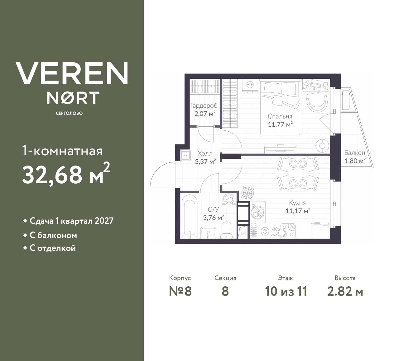 Успейте забронировать, пока действует скидка! Период предложения ограничен! Стоимость квартиры указана со скидкой, ваша экономия составит 701,815 RUB. Информация по телефону, мы вам все подробно расскажем! Продается однокомнатная квартира с предчистовой отделкой в Veren Nort Сертолово на 10 этаже. Общая площадь: 32.68 кв.м., жилая: 11.77 кв.м., площадь просторной куxни-гостиной: 11.17 кв.м. Все окна выходят на одну сторону. В квартире один балкон, один совмещенный санузел. Высота потолков 2.82 м. Квартира находится в корпусе 8. Дом монолитный, одноподъездный, высотой 11 этажей. На этаже 14 квартир. В подъезде 1 пассажирский и 1 грузовой лифт. Окончание строительства - 4 квартал 2026 года. Оформление сделки по договору долевого участия. С балконом, с отделкой, с гардеробом, вид на приватный двор. Сочетание современной архитектуры и отличной экологии севера Лен. области. Выразительный облик домов разработан именитым архитектурным бюро «Остоженка». Характеристики жилого комплекса исключительны: продуманный ландшафтный дизайн, оригинальные парадные, разработанные по индивидуальному дизайн-проекту, современные детские и многофункциональные спортивные площадки, летний кинотеатр под открытым небом, два детских сада. Комплекс создается в уже сложившейся инфраструктуре г. Сертолово и обладает удобным транспортным сообщением с Санкт-Петербургом. В 300 метрах от «VEREN NORT сертолово» планируется транспортно-пересадочный узел «Сертолово», который обеспечит удобную железнодорожную связь с Финляндским вокзалом Санкт-Петербурга. (AQID02418013)