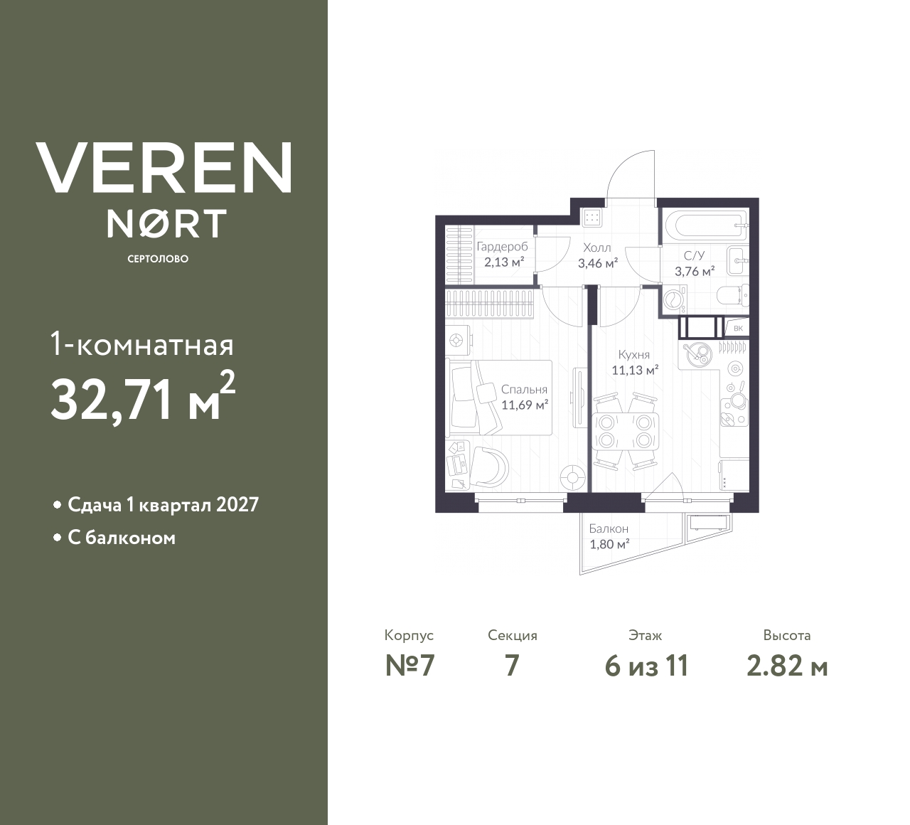 Спешите оформить бронирование по этой цене! Предложение ограничено! Стоимость квартиры указана со скидкой, ваша экономия составит 611,212 RUB. Звоните, наши менеджеры вам все расскажут! Просторная 1-комн. квартира в Veren Nort Сертолово на 6 этаже. Квартира без отделки, новый собственник может сделать ремонт по своему дизайн-проекту. Общая площадь: 32.71 кв.м., жилая: 11.77 кв.м., площадь просторной куxни-гостиной: 11.17 кв.м. Все окна выходят на одну сторону. В квартире один балкон, один совмещенный санузел. Высота потолков 2.82 м. Квартира находится в корпусе 7. Дом монолитный, одноподъездный, высотой 11 этажей. На этаже 14 квартир. В подъезде 1 пассажирский и 1 грузовой лифт. Окончание строительства - 4 квартал 2026 года. Оформление сделки по договору долевого участия. С балконом, с гардеробом, вид на приватный двор. Сочетание современной архитектуры и отличной экологии севера Лен. области. Выразительный облик домов разработан именитым архитектурным бюро «Остоженка». Характеристики жилого комплекса исключительны: продуманный ландшафтный дизайн, оригинальные парадные, разработанные по индивидуальному дизайн-проекту, современные детские и многофункциональные спортивные площадки, летний кинотеатр под открытым небом, два детских сада. Комплекс создается в уже сложившейся инфраструктуре г. Сертолово и обладает удобным транспортным сообщением с Санкт-Петербургом. В 300 метрах от «VEREN NORT сертолово» планируется транспортно-пересадочный узел «Сертолово», который обеспечит удобную железнодорожную связь с Финляндским вокзалом Санкт-Петербурга. (AQID02418027)