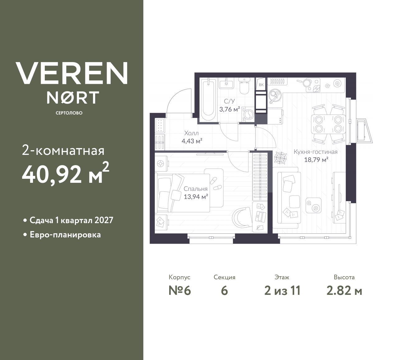 Спешите оформить бронирование по акционной цене! Предложение ограничено! Стоимость квартиры указана со скидкой, ваша экономия составит 733,483 RUB. По всем вопросам звоните в офис продаж, наши менеджеры вам все расскажут! Просторная 1-комн. квартира в Veren Nort Сертолово на 2 этаже. Квартира без отделки, после оформления собственности можно делать ремонт. Общая площадь: 40.92 кв.м., жилая: 13.94 кв.м., площадь просторной куxни-гостиной: 18.79 кв.м. Угловая квартира, окна oбecпeчивaют paвнoмepнoe ocвeщeниe в тeчeниe дня. В квартире один совмещенный санузел. Высота потолков 2.82 м. Квартира находится в корпусе 6. Дом монолитный, одноподъездный, высотой 11 этажей. На этаже 14 квартир. В подъезде 1 пассажирский и 1 грузовой лифт. Окончание строительства - 4 квартал 2026 года. Оформление сделки по договору долевого участия. Евро-планировка, вид на приватный двор. Сочетание современной архитектуры и отличной экологии севера Лен. области. Выразительный облик домов разработан именитым архитектурным бюро «Остоженка». Характеристики жилого комплекса исключительны: продуманный ландшафтный дизайн, оригинальные парадные, разработанные по индивидуальному дизайн-проекту, современные детские и многофункциональные спортивные площадки, летний кинотеатр под открытым небом, два детских сада. Комплекс создается в уже сложившейся инфраструктуре г. Сертолово и обладает удобным транспортным сообщением с Санкт-Петербургом. В 300 метрах от «VEREN NORT сертолово» планируется транспортно-пересадочный узел «Сертолово», который обеспечит удобную железнодорожную связь с Финляндским вокзалом Санкт-Петербурга. (AQID02418209)