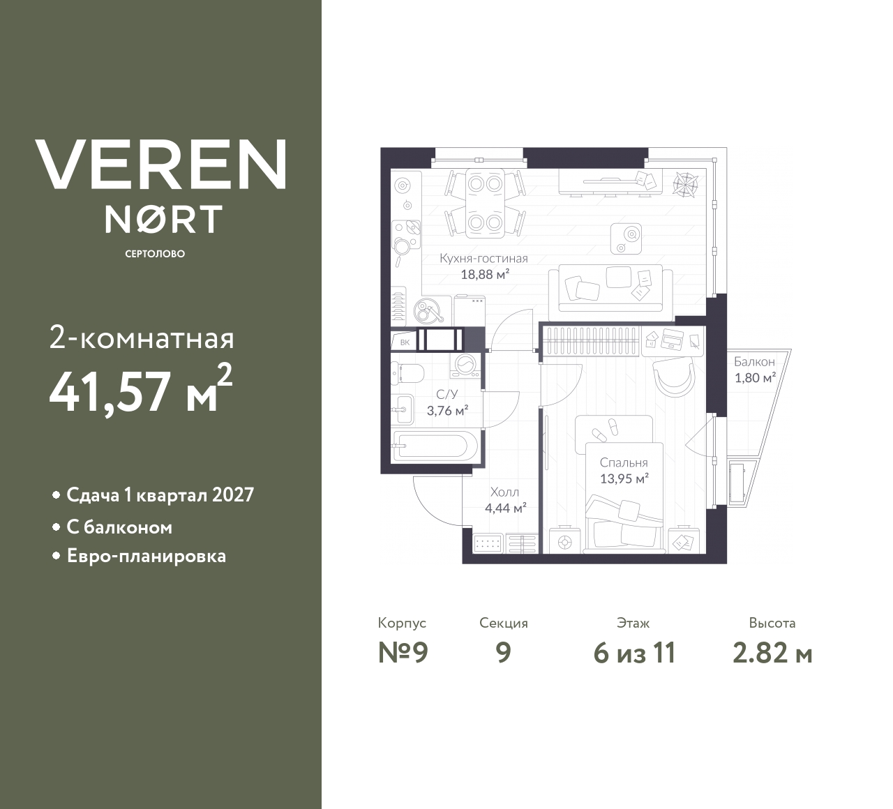 Успейте оформить бронирование по акционной цене! Период акции ограничен! Стоимость квартиры указана со скидкой, ваша экономия составит 759,657 RUB. По всем вопросам обращайтесь в офис продаж, мы вам все подробно расскажем! 1-комн. квартира от застройщика в Veren Nort Сертолово на 6 этаже. Квартира без отделки, полностью готова к чистовой отделке и дальнейшему ремонту. Общая площадь: 41.57 кв.м., жилая: 13.95 кв.м., площадь просторной куxни-гостиной: 18.88 кв.м. Угловая квартира, идеально подойдет любителям тишины и панорамных видов. В квартире один балкон, один совмещенный санузел. Высота потолков 2.82 м. Квартира находится в корпусе 9. Дом монолитный, одноподъездный, высотой 11 этажей. На этаже 14 квартир. В подъезде 1 пассажирский и 1 грузовой лифт. Окончание строительства - 4 квартал 2026 года. Оформление сделки по договору долевого участия. С балконом, евро-планировка, вид на приватный двор. Сочетание современной архитектуры и отличной экологии севера Лен. области. Выразительный облик домов разработан именитым архитектурным бюро «Остоженка». Характеристики жилого комплекса исключительны: продуманный ландшафтный дизайн, оригинальные парадные, разработанные по индивидуальному дизайн-проекту, современные детские и многофункциональные спортивные площадки, летний кинотеатр под открытым небом, два детских сада. Комплекс создается в уже сложившейся инфраструктуре г. Сертолово и обладает удобным транспортным сообщением с Санкт-Петербургом. В 300 метрах от «VEREN NORT сертолово» планируется транспортно-пересадочный узел «Сертолово», который обеспечит удобную железнодорожную связь с Финляндским вокзалом Санкт-Петербурга. (AQID02418279)