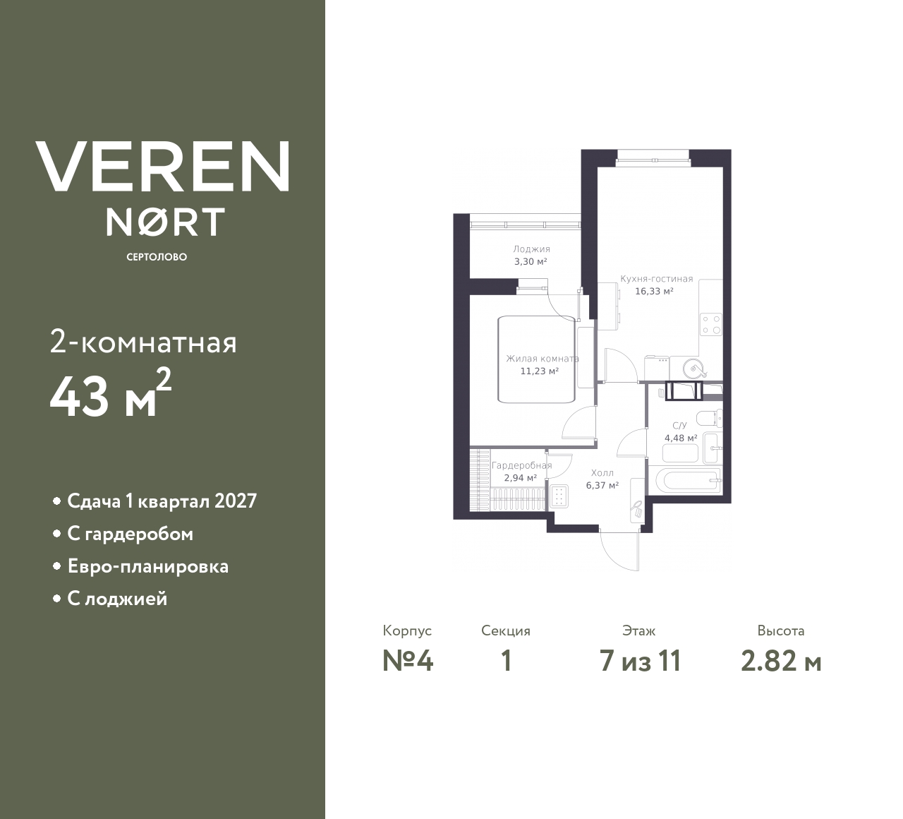 Спешите забронировать на этих условиях! Предложение ограничено! Стоимость квартиры указана со скидкой, ваша экономия составит 1,879,941 RUB. Звоните, наши менеджеры вам все расскажут! Просторная 1-комн. квартира в Veren Nort Сертолово на 7 этаже. Квартира без отделки, после выдачи ключей можно делать ремонт. Общая площадь: 43 кв.м., жилая: 11.23 кв.м., площадь просторной куxни-гостиной: 16.33 кв.м. Все окна выходят на одну сторону. В квартире одна лоджия, один совмещенный санузел. Высота потолков 2.82 м. Квартира находится в корпусе 4. Дом монолитный, одноподъездный, высотой 11 этажей. На этаже 14 квартир. В подъезде 1 пассажирский и 1 грузовой лифт. Начало строительства - 3 квартал 2023 года. Окончание строительства - 4 квартал 2025 года. Оформление сделки по договору долевого участия. С лоджией, евро-планировка, с гардеробом, вид на приватный двор. Сочетание современной архитектуры и отличной экологии севера Лен. области. Выразительный облик домов разработан именитым архитектурным бюро «Остоженка». Характеристики жилого комплекса исключительны: продуманный ландшафтный дизайн, оригинальные парадные, разработанные по индивидуальному дизайн-проекту, современные детские и многофункциональные спортивные площадки, летний кинотеатр под открытым небом, два детских сада. Комплекс создается в уже сложившейся инфраструктуре г. Сертолово и обладает удобным транспортным сообщением с Санкт-Петербургом. В 300 метрах от «VEREN NORT сертолово» планируется транспортно-пересадочный узел «Сертолово», который обеспечит удобную железнодорожную связь с Финляндским вокзалом Санкт-Петербурга. (AQID02411770)