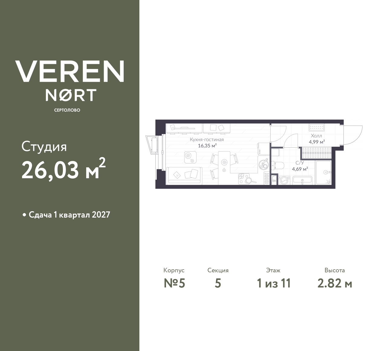 Спешите забронировать, пока действует скидка! Период предложения ограничен! Стоимость квартиры указана со скидкой, ваша экономия составит 464,826 RUB. По всем вопросам звоните в офис продаж, наши менеджеры вам все расскажут! 1-комн. квартира-студия в Veren Nort Сертолово на 1 этаже. Квартира без отделки, новый владелец может сделать ремонт по индивидуальному проекту. Общая площадь: 26.03 кв.м., площадь гостиной 16.34 кв.м., из которых 5 кв.м. выделено под кухонную зону. Все окна выходят на одну сторону. В квартире один совмещенный санузел. Высота потолков 2.82 м. Квартира находится в корпусе 5. Дом монолитный, одноподъездный, высотой 11 этажей. На этаже 14 квартир. В подъезде 1 пассажирский и 1 грузовой лифт. Окончание строительства - 1 квартал 2027 года. Оформление сделки по договору долевого участия. Вид на приватный двор. Сочетание современной архитектуры и отличной экологии севера Лен. области. Выразительный облик домов разработан именитым архитектурным бюро «Остоженка». Характеристики жилого комплекса исключительны: продуманный ландшафтный дизайн, оригинальные парадные, разработанные по индивидуальному дизайн-проекту, современные детские и многофункциональные спортивные площадки, летний кинотеатр под открытым небом, два детских сада. Комплекс создается в уже сложившейся инфраструктуре г. Сертолово и обладает удобным транспортным сообщением с Санкт-Петербургом. В 300 метрах от «VEREN NORT сертолово» планируется транспортно-пересадочный узел «Сертолово», который обеспечит удобную железнодорожную связь с Финляндским вокзалом Санкт-Петербурга. (AQID02417965)