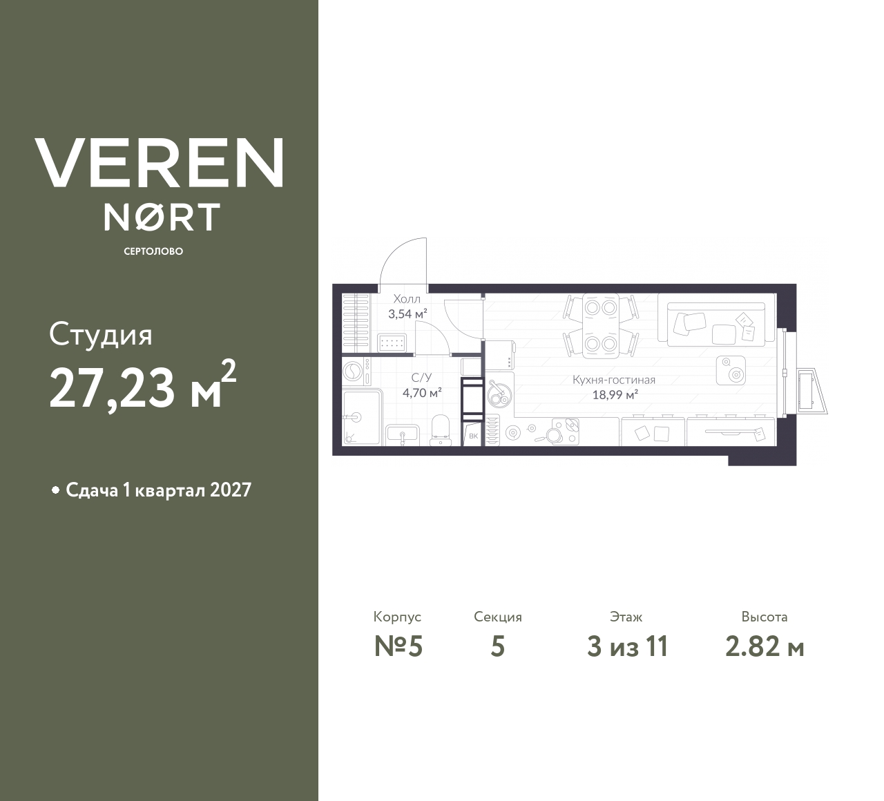 Торопитесь забронировать, пока действует скидка! Срок предложения ограничен! Стоимость квартиры указана со скидкой, ваша экономия составит 493,579 RUB. По всем вопросам звоните в офис продаж, мы вам все подробно расскажем! Однокомнатная квартира-студия в Veren Nort Сертолово на 3 этаже. Квартира без отделки, новый владелец может сделать ремонт по своему проекту. Общая площадь: 27.23 кв.м., площадь гостиной 18.99 кв.м., из которых 5 кв.м. выделено под кухонную зону. Все окна выходят на одну сторону. В квартире один совмещенный санузел. Высота потолков 2.82 м. Квартира находится в корпусе 5. Дом монолитный, одноподъездный, высотой 11 этажей. На этаже 14 квартир. В подъезде 1 пассажирский и 1 грузовой лифт. Окончание строительства - 1 квартал 2027 года. Оформление сделки по договору долевого участия. Вид на приватный двор. Сочетание современной архитектуры и отличной экологии севера Лен. области. Выразительный облик домов разработан именитым архитектурным бюро «Остоженка». Характеристики жилого комплекса исключительны: продуманный ландшафтный дизайн, оригинальные парадные, разработанные по индивидуальному дизайн-проекту, современные детские и многофункциональные спортивные площадки, летний кинотеатр под открытым небом, два детских сада. Комплекс создается в уже сложившейся инфраструктуре г. Сертолово и обладает удобным транспортным сообщением с Санкт-Петербургом. В 300 метрах от «VEREN NORT сертолово» планируется транспортно-пересадочный узел «Сертолово», который обеспечит удобную железнодорожную связь с Финляндским вокзалом Санкт-Петербурга. (AQID02417972)