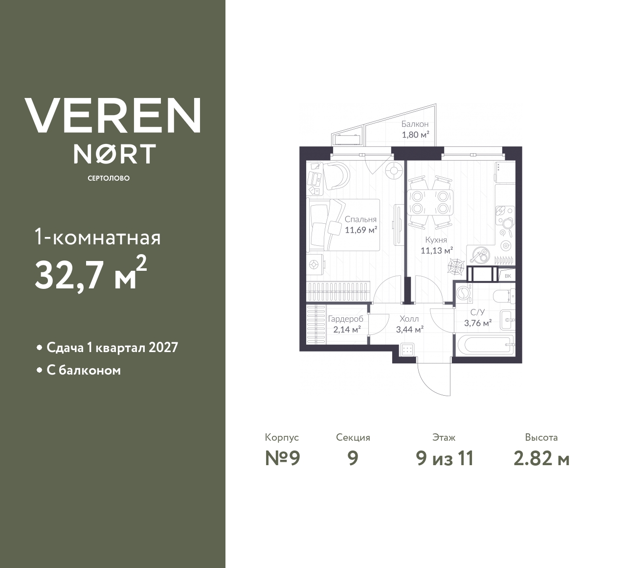 Спешите оформить бронирование по акционной цене! Срок предложения ограничен! Стоимость квартиры указана со скидкой, ваша экономия составит 617,202 RUB. По всем вопросам обращайтесь в офис продаж, наши менеджеры вам все расскажут! 1-комн. квартира в Veren Nort Сертолово на 9 этаже. Квартира без отделки, новый собственник может сделать ремонт по индивидуальному дизайн-проекту. Общая площадь: 32.7 кв.м., жилая: 11.69 кв.м., площадь просторной куxни-гостиной: 11.13 кв.м. Все окна выходят на одну сторону. В квартире один балкон, один совмещенный санузел. Высота потолков 2.82 м. Квартира находится в корпусе 9. Дом монолитный, одноподъездный, высотой 11 этажей. На этаже 14 квартир. В подъезде 1 пассажирский и 1 грузовой лифт. Окончание строительства - 4 квартал 2026 года. Оформление сделки по договору долевого участия. С балконом, с гардеробом, вид на приватный двор. Сочетание современной архитектуры и отличной экологии севера Лен. области. Выразительный облик домов разработан именитым архитектурным бюро «Остоженка». Характеристики жилого комплекса исключительны: продуманный ландшафтный дизайн, оригинальные парадные, разработанные по индивидуальному дизайн-проекту, современные детские и многофункциональные спортивные площадки, летний кинотеатр под открытым небом, два детских сада. Комплекс создается в уже сложившейся инфраструктуре г. Сертолово и обладает удобным транспортным сообщением с Санкт-Петербургом. В 300 метрах от «VEREN NORT сертолово» планируется транспортно-пересадочный узел «Сертолово», который обеспечит удобную железнодорожную связь с Финляндским вокзалом Санкт-Петербурга. (AQID02418021)