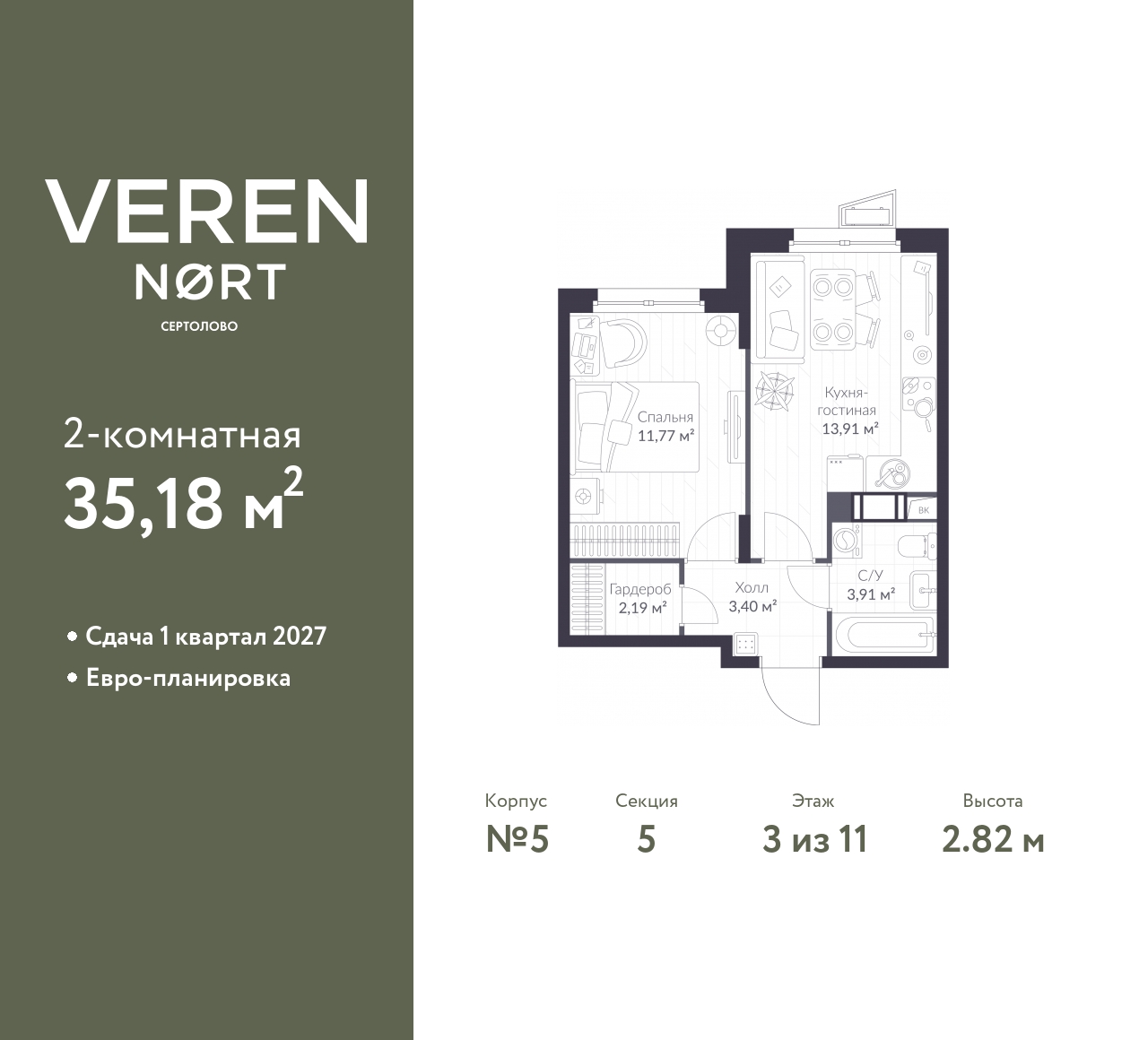 Торопитесь оформить бронирование по этой цене! Период акции ограничен! Стоимость квартиры указана со скидкой, ваша экономия составит 629,635 RUB. По всем вопросам обращайтесь в офис продаж, мы вам все подробно расскажем! Однокомнатная квартира от застройщика в Veren Nort Сертолово на 3 этаже. Квартира без отделки, новый собственник может сделать ремонт по индивидуальному проекту. Общая площадь: 35.18 кв.м., жилая: 11.77 кв.м., площадь просторной куxни-гостиной: 13.91 кв.м. Все окна выходят на одну сторону. В квартире один совмещенный санузел. Высота потолков 2.82 м. Квартира находится в корпусе 5. Дом монолитный, одноподъездный, высотой 11 этажей. На этаже 14 квартир. В подъезде 1 пассажирский и 1 грузовой лифт. Окончание строительства - 1 квартал 2027 года. Оформление сделки по договору долевого участия. Евро-планировка, с гардеробом, вид на приватный двор. Сочетание современной архитектуры и отличной экологии севера Лен. области. Выразительный облик домов разработан именитым архитектурным бюро «Остоженка». Характеристики жилого комплекса исключительны: продуманный ландшафтный дизайн, оригинальные парадные, разработанные по индивидуальному дизайн-проекту, современные детские и многофункциональные спортивные площадки, летний кинотеатр под открытым небом, два детских сада. Комплекс создается в уже сложившейся инфраструктуре г. Сертолово и обладает удобным транспортным сообщением с Санкт-Петербургом. В 300 метрах от «VEREN NORT сертолово» планируется транспортно-пересадочный узел «Сертолово», который обеспечит удобную железнодорожную связь с Финляндским вокзалом Санкт-Петербурга. (AQID02418042)