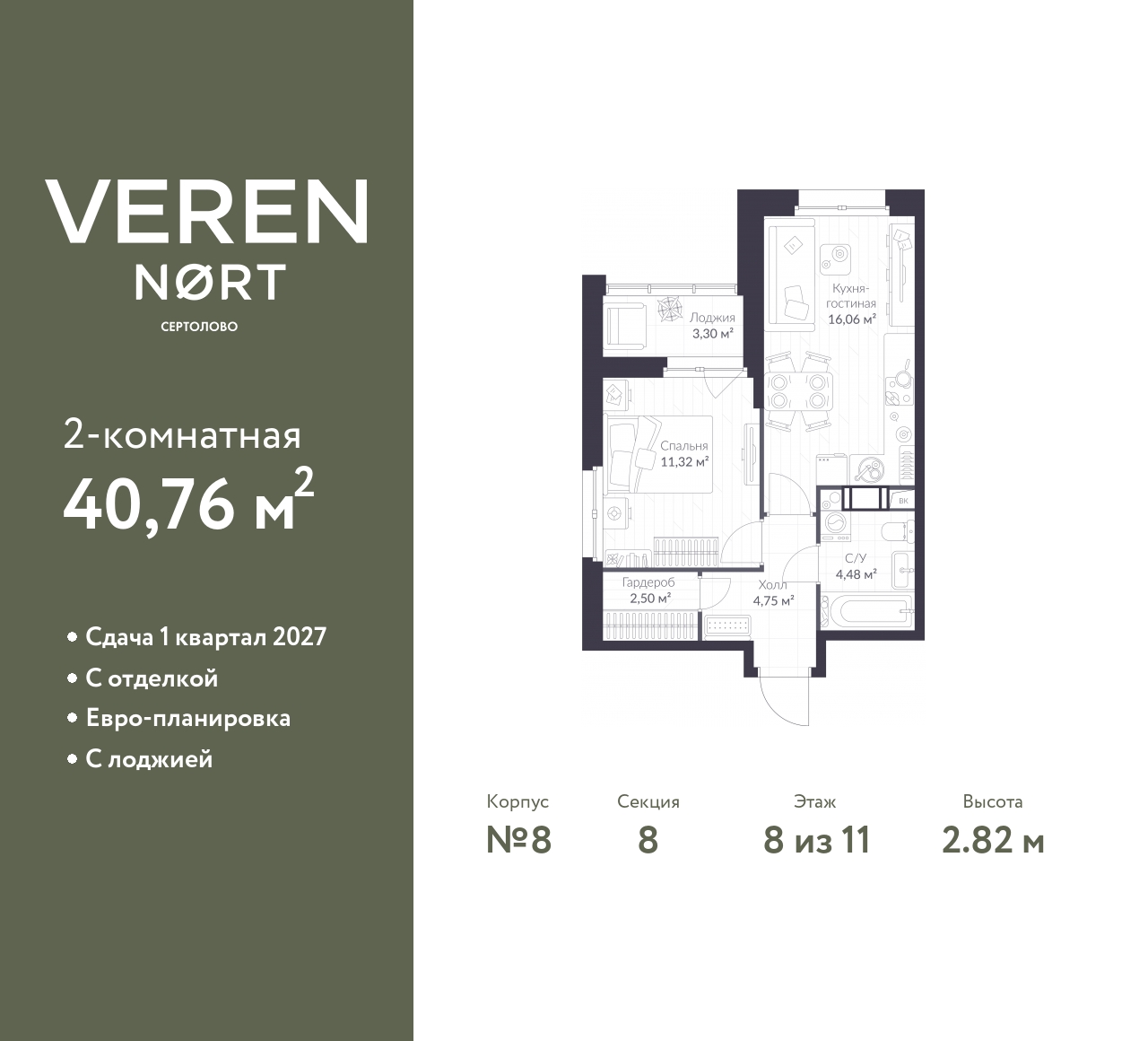 Торопитесь оформить бронирование на этих условиях! Период акции ограничен! Стоимость квартиры указана со скидкой, ваша экономия составит 863,118 RUB. По всем вопросам обращайтесь в офис продаж, наши менеджеры вам все расскажут! Просторная однокомнатная квартира с предчистовой отделкой в Veren Nort Сертолово на 8 этаже. Общая площадь: 40.76 кв.м., жилая: 11.32 кв.м., площадь просторной куxни-гостиной: 16.06 кв.м. Угловая квартира, идеально подойдет любителям тишины и панорамных видов. В квартире одна лоджия, один совмещенный санузел. Высота потолков 2.82 м. Квартира находится в корпусе 8. Дом монолитный, одноподъездный, высотой 11 этажей. На этаже 14 квартир. В подъезде 1 пассажирский и 1 грузовой лифт. Окончание строительства - 4 квартал 2026 года. Оформление сделки по договору долевого участия. С лоджией, евро-планировка, с отделкой, с гардеробом, вид на приватный двор. Сочетание современной архитектуры и отличной экологии севера Лен. области. Выразительный облик домов разработан именитым архитектурным бюро «Остоженка». Характеристики жилого комплекса исключительны: продуманный ландшафтный дизайн, оригинальные парадные, разработанные по индивидуальному дизайн-проекту, современные детские и многофункциональные спортивные площадки, летний кинотеатр под открытым небом, два детских сада. Комплекс создается в уже сложившейся инфраструктуре г. Сертолово и обладает удобным транспортным сообщением с Санкт-Петербургом. В 300 метрах от «VEREN NORT сертолово» планируется транспортно-пересадочный узел «Сертолово», который обеспечит удобную железнодорожную связь с Финляндским вокзалом Санкт-Петербурга. (AQID02418196)