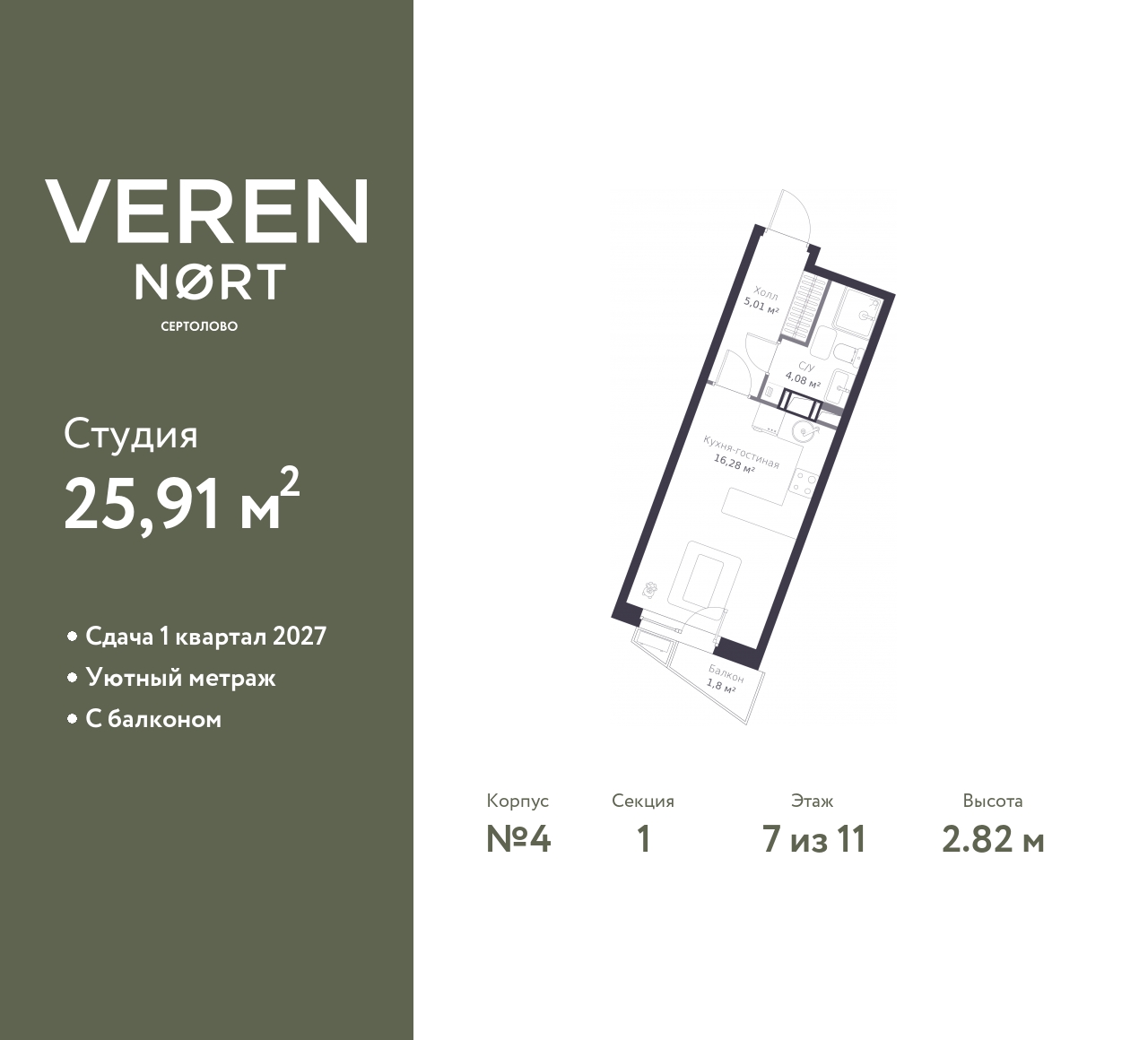 Торопитесь забронировать на этих условиях! Период акции ограничен! Стоимость квартиры указана со скидкой, ваша экономия составит 1,166,474 RUB. Звоните, мы вам все подробно расскажем! 1-комн. квартира-студия от застройщика в Veren Nort Сертолово на 7 этаже. Квартира без отделки, после выдачи ключей можно делать ремонт. Общая площадь: 25.91 кв.м., площадь гостиной 16.28 кв.м., из которых 3 кв.м. выделено под кухонную зону. Все окна выходят на одну сторону. В квартире один балкон, один совмещенный санузел. Высота потолков 2.82 м. Квартира находится в корпусе 4. Дом монолитный, одноподъездный, высотой 11 этажей. На этаже 14 квартир. В подъезде 1 пассажирский и 1 грузовой лифт. Начало строительства - 3 квартал 2023 года. Окончание строительства - 4 квартал 2025 года. Оформление сделки по договору долевого участия. С балконом, вид на приватный двор. Сочетание современной архитектуры и отличной экологии севера Лен. области. Выразительный облик домов разработан именитым архитектурным бюро «Остоженка». Характеристики жилого комплекса исключительны: продуманный ландшафтный дизайн, оригинальные парадные, разработанные по индивидуальному дизайн-проекту, современные детские и многофункциональные спортивные площадки, летний кинотеатр под открытым небом, два детских сада. Комплекс создается в уже сложившейся инфраструктуре г. Сертолово и обладает удобным транспортным сообщением с Санкт-Петербургом. В 300 метрах от «VEREN NORT сертолово» планируется транспортно-пересадочный узел «Сертолово», который обеспечит удобную железнодорожную связь с Финляндским вокзалом Санкт-Петербурга. (AQID02349289)