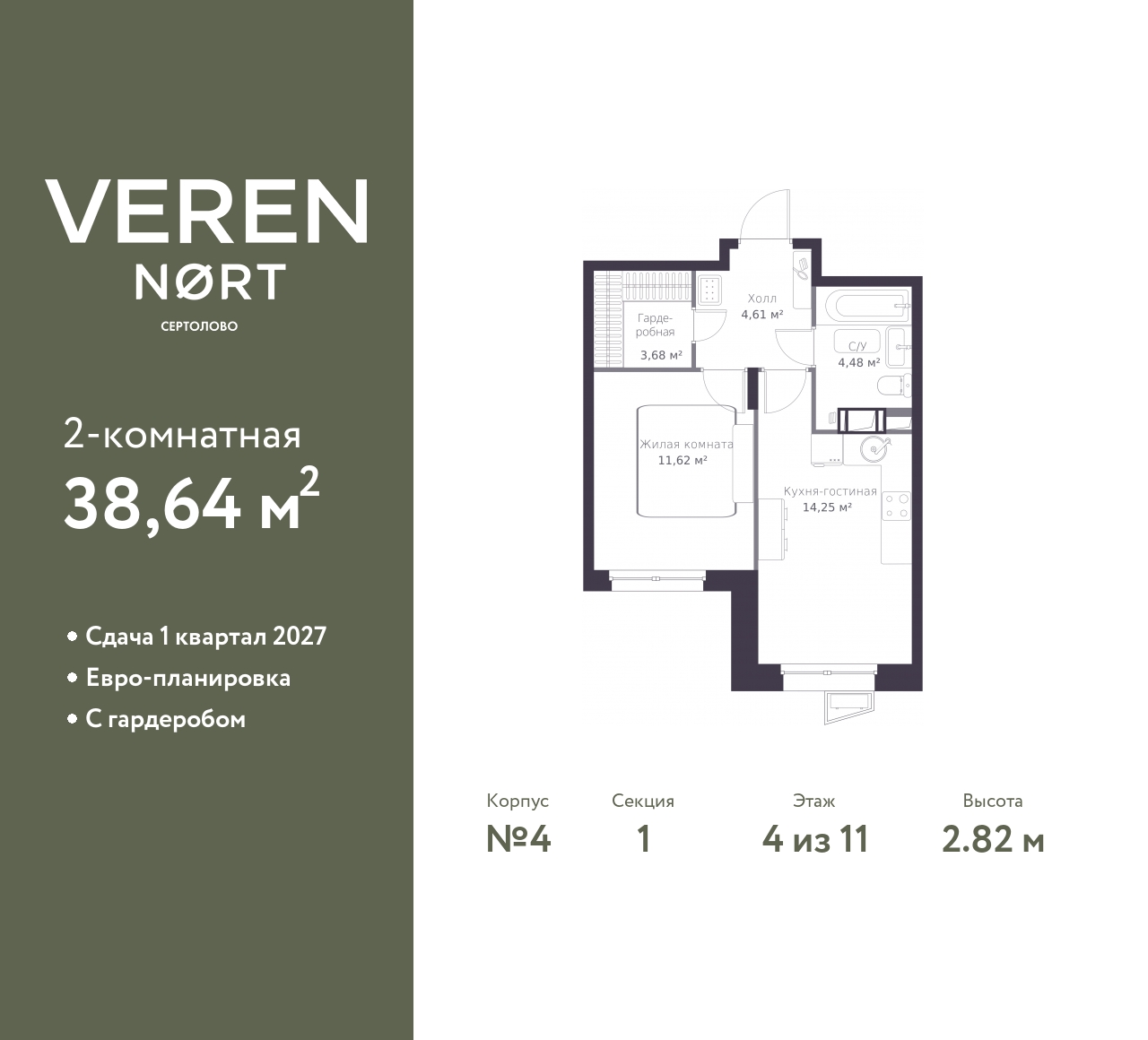 Торопитесь забронировать по этой цене! Период акции ограничен! Стоимость квартиры указана со скидкой, ваша экономия составит 1,698,946 RUB. По всем вопросам звоните в офис продаж, наши менеджеры вам все расскажут! Продается 1-комн. квартира от застройщика в Veren Nort Сертолово на 4 этаже. Квартира без отделки, полностью готова к чистовой отделке и дальнейшему ремонту. Общая площадь: 38.64 кв.м., жилая: 11.62 кв.м., площадь просторной куxни-гостиной: 14.25 кв.м. Все окна выходят на одну сторону. В квартире один совмещенный санузел. Высота потолков 2.82 м. Квартира находится в корпусе 4. Дом монолитный, одноподъездный, высотой 11 этажей. На этаже 14 квартир. В подъезде 1 пассажирский и 1 грузовой лифт. Начало строительства - 3 квартал 2023 года. Окончание строительства - 4 квартал 2025 года. Оформление сделки по договору долевого участия. Евро-планировка, с гардеробом, вид на приватный двор. Сочетание современной архитектуры и отличной экологии севера Лен. области. Выразительный облик домов разработан именитым архитектурным бюро «Остоженка». Характеристики жилого комплекса исключительны: продуманный ландшафтный дизайн, оригинальные парадные, разработанные по индивидуальному дизайн-проекту, современные детские и многофункциональные спортивные площадки, летний кинотеатр под открытым небом, два детских сада. Комплекс создается в уже сложившейся инфраструктуре г. Сертолово и обладает удобным транспортным сообщением с Санкт-Петербургом. В 300 метрах от «VEREN NORT сертолово» планируется транспортно-пересадочный узел «Сертолово», который обеспечит удобную железнодорожную связь с Финляндским вокзалом Санкт-Петербурга. (AQID02411673)