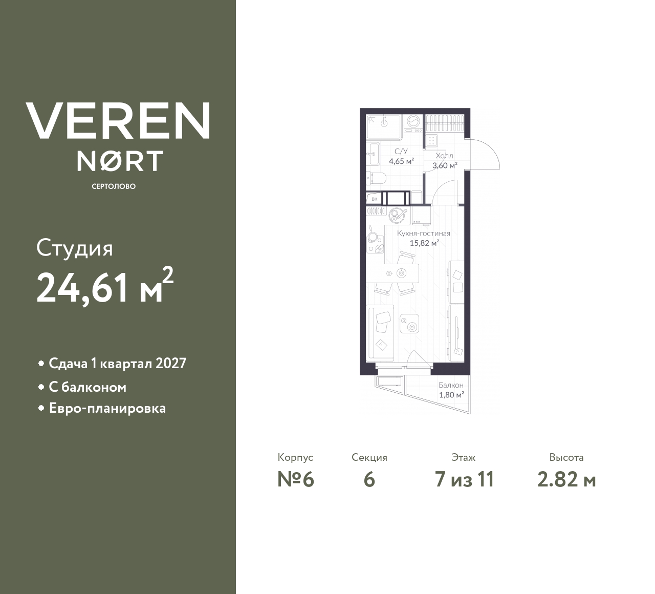 Успейте забронировать по акционной цене! Период акции ограничен! Стоимость квартиры указана со скидкой, ваша экономия составит 469,099 RUB. Звоните, мы вам все подробно расскажем! 1-комн. квартира-студия от застройщика в Veren Nort Сертолово на 7 этаже. Квартира без отделки, полностью готова к чистовой отделке и дальнейшему ремонту. Общая площадь: 24.61 кв.м., площадь гостиной 15.82 кв.м., из которых 5 кв.м. выделено под кухонную зону. Все окна выходят на одну сторону. В квартире один балкон, один совмещенный санузел. Высота потолков 2.82 м. Квартира находится в корпусе 6. Дом монолитный, одноподъездный, высотой 11 этажей. На этаже 14 квартир. В подъезде 1 пассажирский и 1 грузовой лифт. Окончание строительства - 4 квартал 2026 года. Оформление сделки по договору долевого участия. С балконом, вид на приватный двор. Сочетание современной архитектуры и отличной экологии севера Лен. области. Выразительный облик домов разработан именитым архитектурным бюро «Остоженка». Характеристики жилого комплекса исключительны: продуманный ландшафтный дизайн, оригинальные парадные, разработанные по индивидуальному дизайн-проекту, современные детские и многофункциональные спортивные площадки, летний кинотеатр под открытым небом, два детских сада. Комплекс создается в уже сложившейся инфраструктуре г. Сертолово и обладает удобным транспортным сообщением с Санкт-Петербургом. В 300 метрах от «VEREN NORT сертолово» планируется транспортно-пересадочный узел «Сертолово», который обеспечит удобную железнодорожную связь с Финляндским вокзалом Санкт-Петербурга. (AQID02417861)