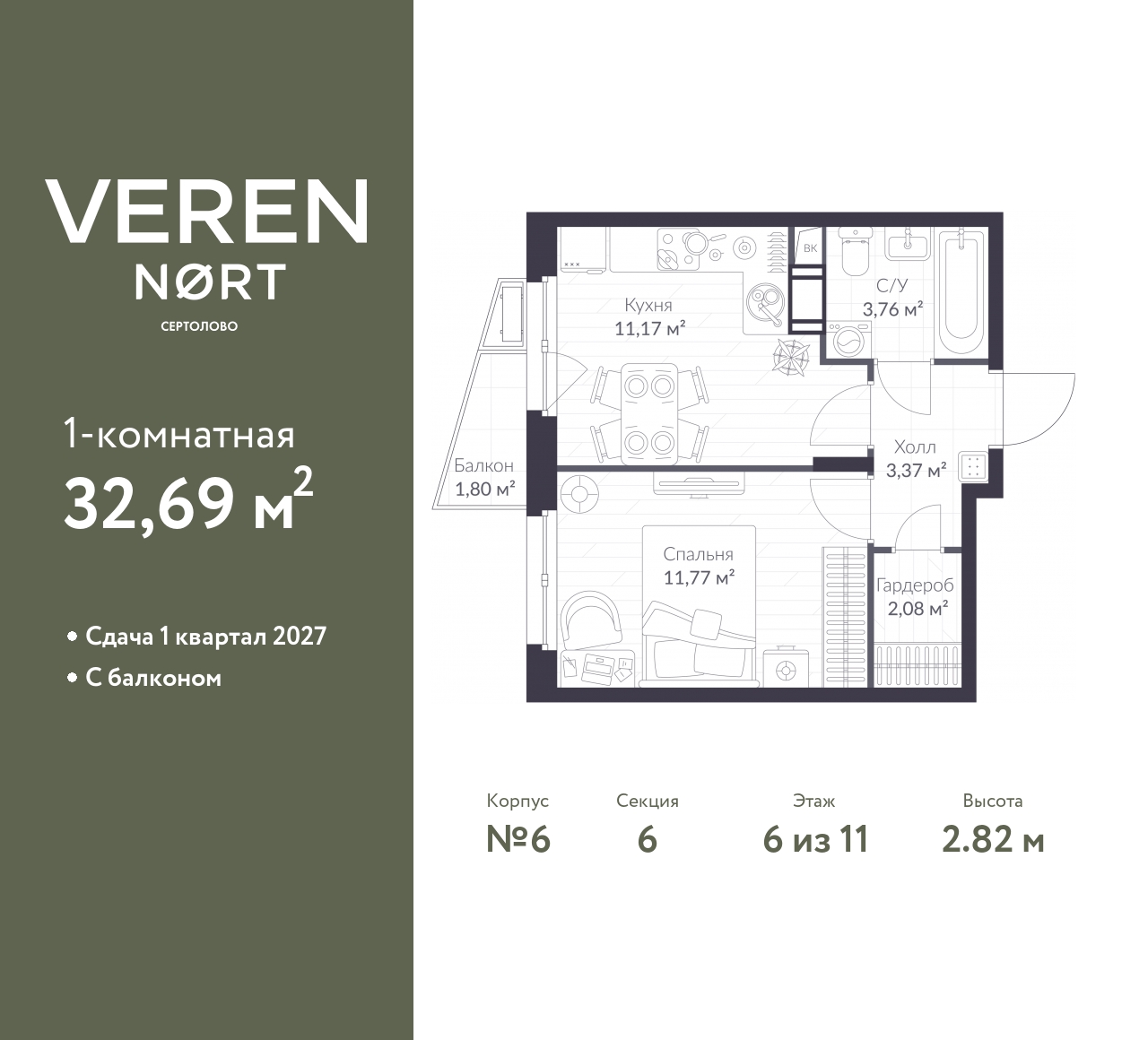Успейте оформить бронирование по этой цене! Предложение ограничено! Стоимость квартиры указана со скидкой, ваша экономия составит 615,443 RUB. Звоните, мы вам все подробно расскажем! 1-комн. квартира в Veren Nort Сертолово на 6 этаже. Квартира без отделки, новый владелец может сделать ремонт по индивидуальному дизайн-проекту. Общая площадь: 32.69 кв.м., жилая: 11.77 кв.м., площадь просторной куxни-гостиной: 11.17 кв.м. Все окна выходят на одну сторону. В квартире один балкон, один совмещенный санузел. Высота потолков 2.82 м. Квартира находится в корпусе 6. Дом монолитный, одноподъездный, высотой 11 этажей. На этаже 14 квартир. В подъезде 1 пассажирский и 1 грузовой лифт. Окончание строительства - 4 квартал 2026 года. Оформление сделки по договору долевого участия. С балконом, с гардеробом, вид на приватный двор. Сочетание современной архитектуры и отличной экологии севера Лен. области. Выразительный облик домов разработан именитым архитектурным бюро «Остоженка». Характеристики жилого комплекса исключительны: продуманный ландшафтный дизайн, оригинальные парадные, разработанные по индивидуальному дизайн-проекту, современные детские и многофункциональные спортивные площадки, летний кинотеатр под открытым небом, два детских сада. Комплекс создается в уже сложившейся инфраструктуре г. Сертолово и обладает удобным транспортным сообщением с Санкт-Петербургом. В 300 метрах от «VEREN NORT сертолово» планируется транспортно-пересадочный узел «Сертолово», который обеспечит удобную железнодорожную связь с Финляндским вокзалом Санкт-Петербурга. (AQID02418015)