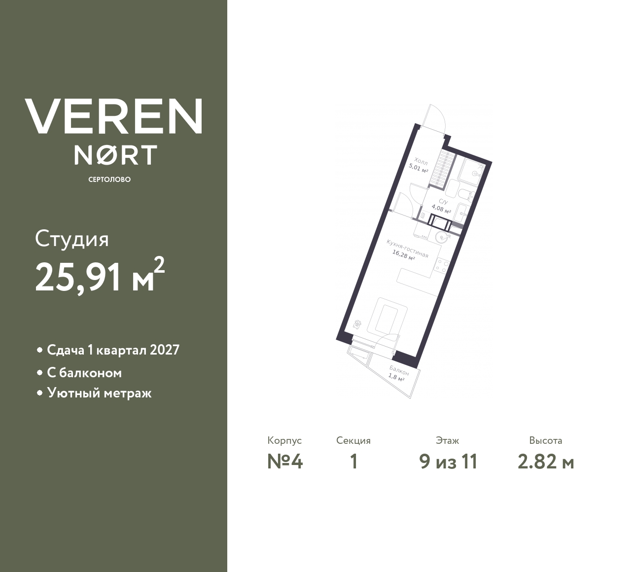Успейте забронировать, пока действует скидка! Предложение ограничено! Стоимость квартиры указана со скидкой, ваша экономия составит 1,175,376 RUB. Звоните, наши менеджеры вам все расскажут! Однокомнатная квартира-студия в Veren Nort Сертолово на 9 этаже. Квартира без отделки, полностью готова к ремонту. Общая площадь: 25.91 кв.м., площадь гостиной 16.28 кв.м., из которых 3 кв.м. выделено под кухонную зону. Все окна выходят на одну сторону. В квартире один балкон, один совмещенный санузел. Высота потолков 2.82 м. Квартира находится в корпусе 4. Дом монолитный, одноподъездный, высотой 11 этажей. На этаже 14 квартир. В подъезде 1 пассажирский и 1 грузовой лифт. Начало строительства - 3 квартал 2023 года. Окончание строительства - 4 квартал 2025 года. Оформление сделки по договору долевого участия. С балконом, вид на приватный двор. Сочетание современной архитектуры и отличной экологии севера Лен. области. Выразительный облик домов разработан именитым архитектурным бюро «Остоженка». Характеристики жилого комплекса исключительны: продуманный ландшафтный дизайн, оригинальные парадные, разработанные по индивидуальному дизайн-проекту, современные детские и многофункциональные спортивные площадки, летний кинотеатр под открытым небом, два детских сада. Комплекс создается в уже сложившейся инфраструктуре г. Сертолово и обладает удобным транспортным сообщением с Санкт-Петербургом. В 300 метрах от «VEREN NORT сертолово» планируется транспортно-пересадочный узел «Сертолово», который обеспечит удобную железнодорожную связь с Финляндским вокзалом Санкт-Петербурга. (AQID02349290)