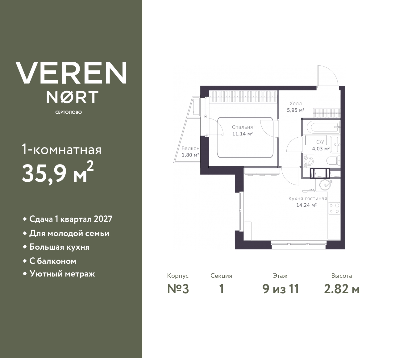 Торопитесь оформить бронирование по акционной цене! Срок предложения ограничен! Стоимость квартиры указана со скидкой, ваша экономия составит 1,542,547 RUB. Информация по телефону, мы вам все подробно расскажем! Просторная однокомнатная квартира в Veren Nort Сертолово на 9 этаже. Квартира без отделки, полностью готова к ремонту. Общая площадь: 35.9 кв.м., жилая: 11.14 кв.м., площадь просторной куxни-гостиной: 14.24 кв.м. Угловая квартира, очень светлая, естественная вентиляция при открытии окон. В квартире один балкон, один совмещенный санузел. Высота потолков 2.82 м. Квартира находится в корпусе 3. Дом монолитный, одноподъездный, высотой 11 этажей. На этаже 6 квартир. В подъезде 1 пассажирский и 1 грузовой лифт. Начало строительства - 3 квартал 2023 года. Окончание строительства - 4 квартал 2025 года. Оформление сделки по договору долевого участия. С балконом, евро-планировка, вид на приватный двор. Сочетание современной архитектуры и отличной экологии севера Лен. области. Выразительный облик домов разработан именитым архитектурным бюро «Остоженка». Характеристики жилого комплекса исключительны: продуманный ландшафтный дизайн, оригинальные парадные, разработанные по индивидуальному дизайн-проекту, современные детские и многофункциональные спортивные площадки, летний кинотеатр под открытым небом, два детских сада. Комплекс создается в уже сложившейся инфраструктуре г. Сертолово и обладает удобным транспортным сообщением с Санкт-Петербургом. В 300 метрах от «VEREN NORT сертолово» планируется транспортно-пересадочный узел «Сертолово», который обеспечит удобную железнодорожную связь с Финляндским вокзалом Санкт-Петербурга. (AQID02349332)