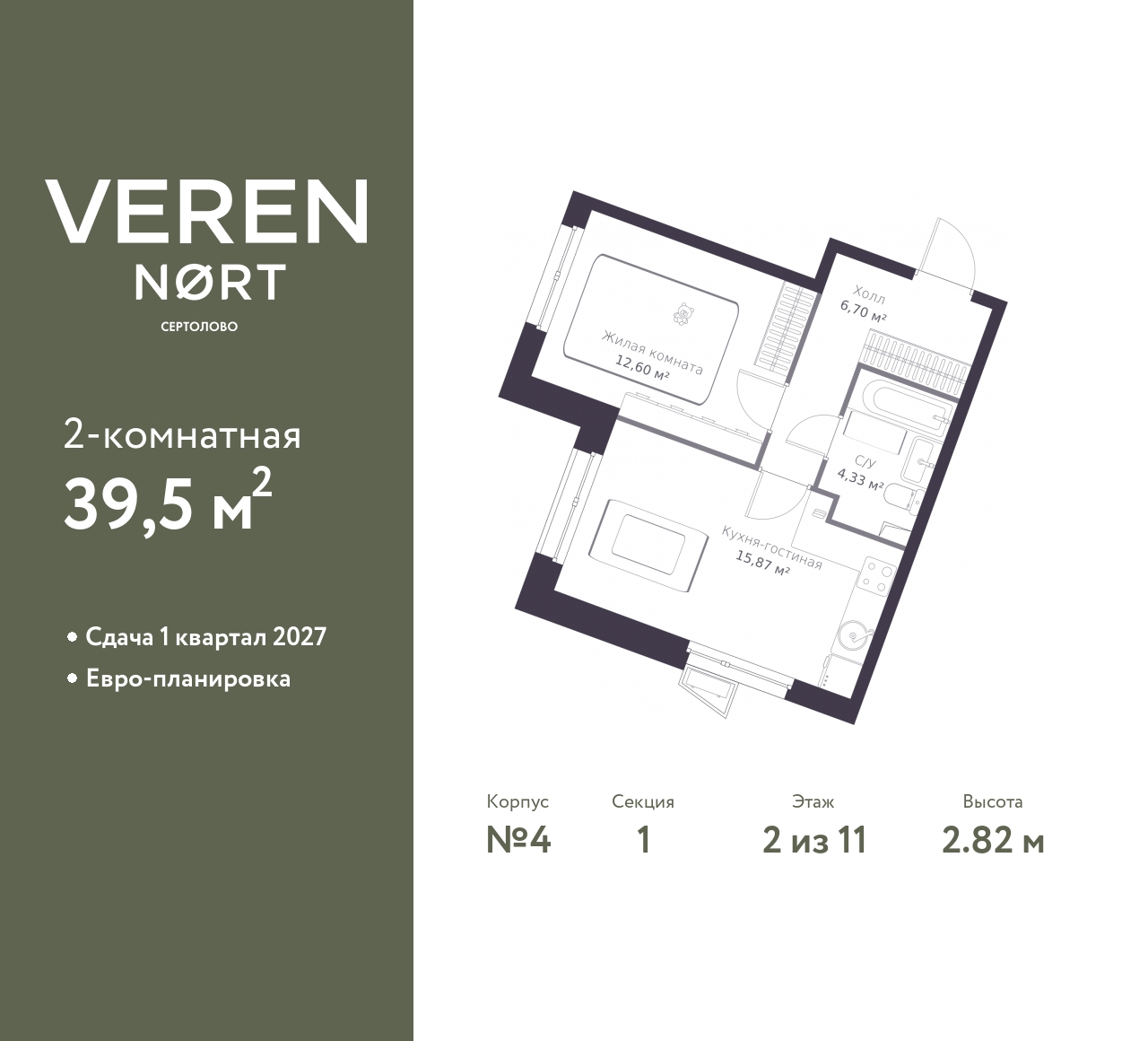 Спешите оформить бронирование, пока действует скидка! Срок предложения ограничен! Стоимость квартиры указана со скидкой, ваша экономия составит 1,719,710 RUB. Звоните, наши менеджеры вам все расскажут! 1-комн. квартира от застройщика в Veren Nort Сертолово на 2 этаже. Квартира без отделки, после получения ключей можно делать ремонт. Общая площадь: 39.5 кв.м., жилая: 12.6 кв.м., площадь просторной куxни-гостиной: 15.87 кв.м. Угловая квартира, идеально подойдет любителям тишины и панорамных видов. В квартире один совмещенный санузел. Высота потолков 2.82 м. Квартира находится в корпусе 4. Дом монолитный, одноподъездный, высотой 11 этажей. На этаже 14 квартир. В подъезде 1 пассажирский и 1 грузовой лифт. Начало строительства - 3 квартал 2023 года. Окончание строительства - 4 квартал 2025 года. Оформление сделки по договору долевого участия. Евро-планировка, вид на приватный двор. Сочетание современной архитектуры и отличной экологии севера Лен. области. Выразительный облик домов разработан именитым архитектурным бюро «Остоженка». Характеристики жилого комплекса исключительны: продуманный ландшафтный дизайн, оригинальные парадные, разработанные по индивидуальному дизайн-проекту, современные детские и многофункциональные спортивные площадки, летний кинотеатр под открытым небом, два детских сада. Комплекс создается в уже сложившейся инфраструктуре г. Сертолово и обладает удобным транспортным сообщением с Санкт-Петербургом. В 300 метрах от «VEREN NORT сертолово» планируется транспортно-пересадочный узел «Сертолово», который обеспечит удобную железнодорожную связь с Финляндским вокзалом Санкт-Петербурга. (AQID02411688)