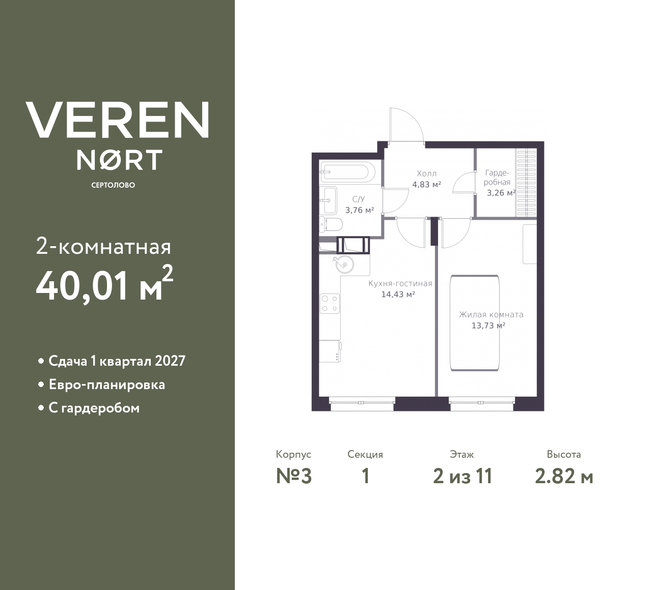 Торопитесь забронировать по этой цене! Срок предложения ограничен! Стоимость квартиры указана со скидкой, ваша экономия составит 1,719,145 RUB. Звоните, наши менеджеры вам все расскажут! 1-комн. квартира от застройщика в Veren Nort Сертолово на 2 этаже. Квартира без отделки, новый владелец может сделать ремонт по индивидуальному дизайн-проекту. Общая площадь: 40.01 кв.м., жилая: 13.73 кв.м., площадь просторной куxни-гостиной: 14.43 кв.м. Все окна выходят на одну сторону. В квартире один совмещенный санузел. Высота потолков 2.82 м. Квартира находится в корпусе 3. Дом монолитный, одноподъездный, высотой 11 этажей. На этаже 6 квартир. В подъезде 1 пассажирский и 1 грузовой лифт. Начало строительства - 3 квартал 2023 года. Окончание строительства - 4 квартал 2025 года. Оформление сделки по договору долевого участия. Евро-планировка, с гардеробом, вид на приватный двор. Сочетание современной архитектуры и отличной экологии севера Лен. области. Выразительный облик домов разработан именитым архитектурным бюро «Остоженка». Характеристики жилого комплекса исключительны: продуманный ландшафтный дизайн, оригинальные парадные, разработанные по индивидуальному дизайн-проекту, современные детские и многофункциональные спортивные площадки, летний кинотеатр под открытым небом, два детских сада. Комплекс создается в уже сложившейся инфраструктуре г. Сертолово и обладает удобным транспортным сообщением с Санкт-Петербургом. В 300 метрах от «VEREN NORT сертолово» планируется транспортно-пересадочный узел «Сертолово», который обеспечит удобную железнодорожную связь с Финляндским вокзалом Санкт-Петербурга. (AQID02411716)