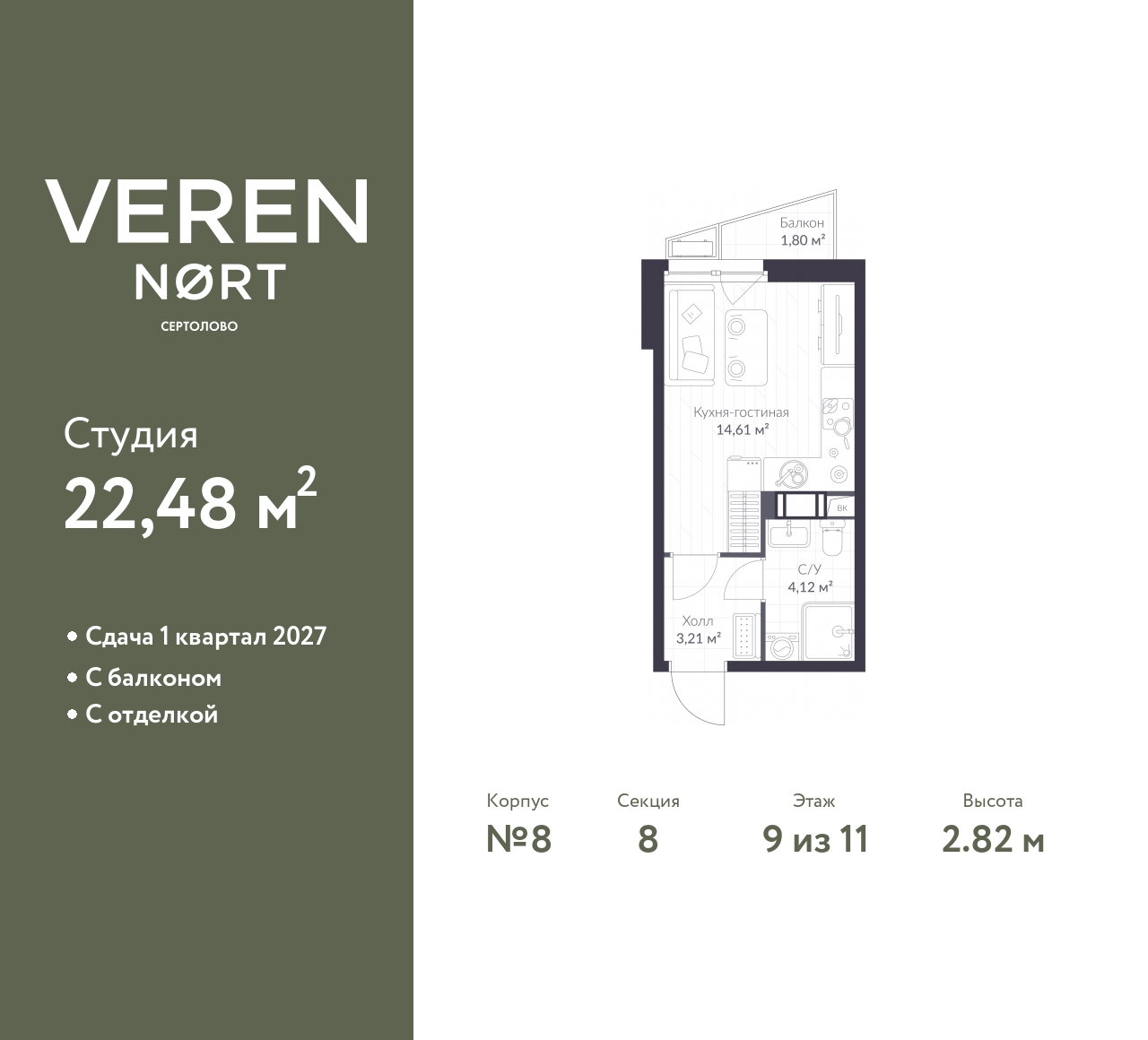 Успейте оформить бронирование по этой цене! Предложение ограничено! Стоимость квартиры указана со скидкой, ваша экономия составит 491,382 RUB. Звоните, наши менеджеры вам все расскажут! Продается 1-комн. квартира-студия с предчистовой отделкой в Veren Nort Сертолово на 9 этаже. Общая площадь: 22.48 кв.м., площадь гостиной 14.61 кв.м., из которых 5 кв.м. выделено под кухонную зону. Все окна выходят на одну сторону. В квартире один балкон, один совмещенный санузел. Высота потолков 2.82 м. Квартира находится в корпусе 8. Дом монолитный, одноподъездный, высотой 11 этажей. На этаже 14 квартир. В подъезде 1 пассажирский и 1 грузовой лифт. Окончание строительства - 4 квартал 2026 года. Оформление сделки по договору долевого участия. С балконом, с отделкой, вид на приватный двор. Сочетание современной архитектуры и отличной экологии севера Лен. области. Выразительный облик домов разработан именитым архитектурным бюро «Остоженка». Характеристики жилого комплекса исключительны: продуманный ландшафтный дизайн, оригинальные парадные, разработанные по индивидуальному дизайн-проекту, современные детские и многофункциональные спортивные площадки, летний кинотеатр под открытым небом, два детских сада. Комплекс создается в уже сложившейся инфраструктуре г. Сертолово и обладает удобным транспортным сообщением с Санкт-Петербургом. В 300 метрах от «VEREN NORT сертолово» планируется транспортно-пересадочный узел «Сертолово», который обеспечит удобную железнодорожную связь с Финляндским вокзалом Санкт-Петербурга. (AQID02417806)