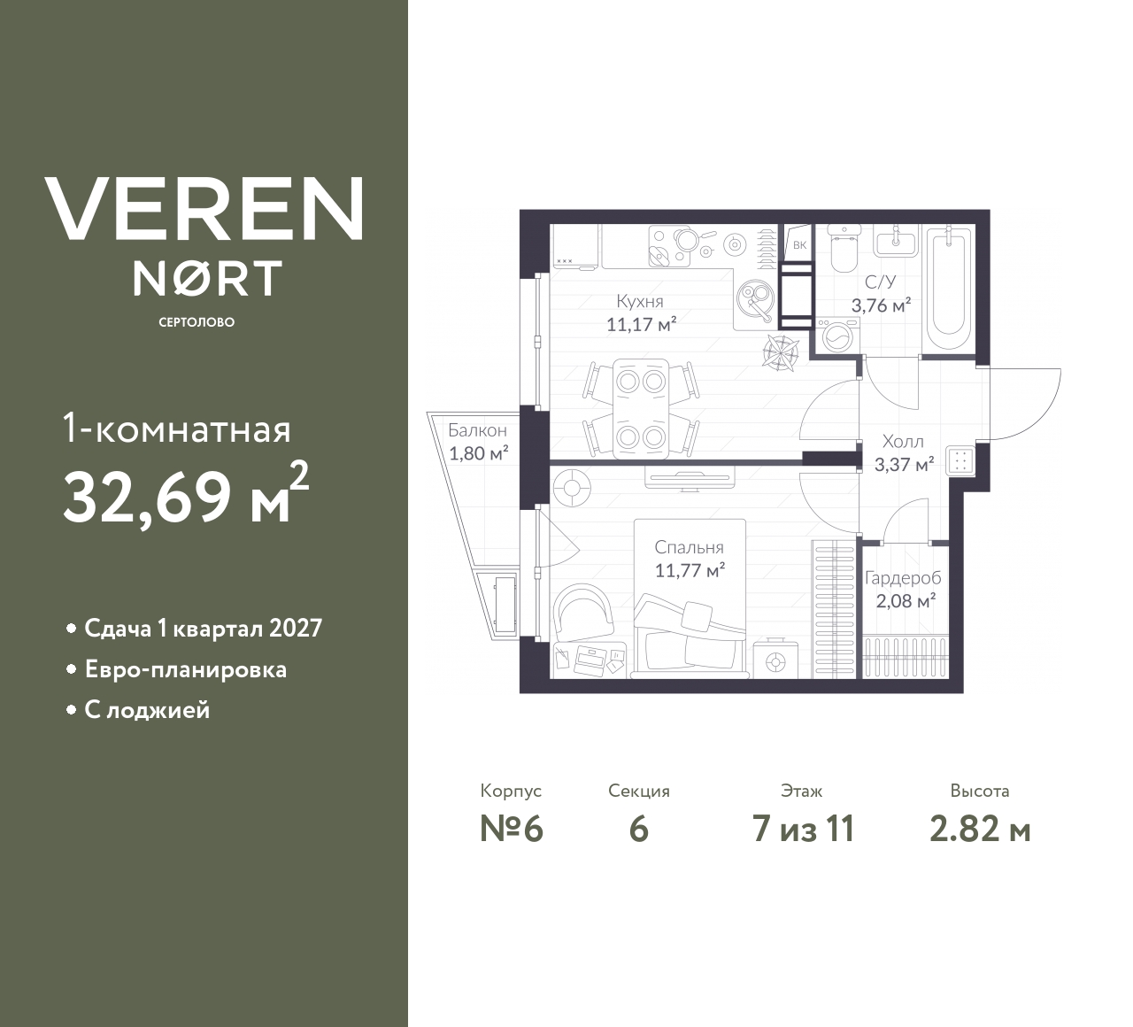 Успейте оформить бронирование на этих условиях! Срок предложения ограничен! Стоимость квартиры указана со скидкой, ваша экономия составит 621,349 RUB. Информация по телефону, наши менеджеры вам все расскажут! 1-комн. квартира от застройщика в Veren Nort Сертолово на 7 этаже. Квартира без отделки, новый собственник может сделать ремонт по своему проекту. Общая площадь: 32.69 кв.м., жилая: 11.77 кв.м., площадь просторной куxни-гостиной: 11.17 кв.м. Все окна выходят на одну сторону. В квартире один балкон, один совмещенный санузел. Высота потолков 2.82 м. Квартира находится в корпусе 6. Дом монолитный, одноподъездный, высотой 11 этажей. На этаже 14 квартир. В подъезде 1 пассажирский и 1 грузовой лифт. Окончание строительства - 4 квартал 2026 года. Оформление сделки по договору долевого участия. С балконом, с гардеробом, вид на приватный двор. Сочетание современной архитектуры и отличной экологии севера Лен. области. Выразительный облик домов разработан именитым архитектурным бюро «Остоженка». Характеристики жилого комплекса исключительны: продуманный ландшафтный дизайн, оригинальные парадные, разработанные по индивидуальному дизайн-проекту, современные детские и многофункциональные спортивные площадки, летний кинотеатр под открытым небом, два детских сада. Комплекс создается в уже сложившейся инфраструктуре г. Сертолово и обладает удобным транспортным сообщением с Санкт-Петербургом. В 300 метрах от «VEREN NORT сертолово» планируется транспортно-пересадочный узел «Сертолово», который обеспечит удобную железнодорожную связь с Финляндским вокзалом Санкт-Петербурга. (AQID02418016)