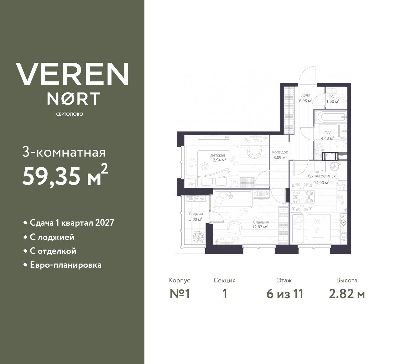 Торопитесь оформить бронирование, пока действует скидка! Предложение ограничено! Стоимость квартиры указана со скидкой, ваша экономия составит 2,639,693 RUB. Звоните, наши менеджеры вам все расскажут! Продается двухкомнатная квартира от застройщика в Veren Nort Сертолово на 6 этаже. Квартира без отделки, новый собственник может сделать ремонт по индивидуальному проекту. Общая площадь: 59.35 кв.м., жилая: 26.81 кв.м., площадь просторной куxни-гостиной: 14.9 кв.м. Квартира угловая, очень светлая, естественная вентиляция при открытии окон. В квартире одна лоджия, один совмещенный и один раздельный санузел. Высота потолков 2.82 м. Квартира находится в корпусе 1. Дом монолитный, одноподъездный, высотой 11 этажей. На этаже 14 квартир. В подъезде 2 грузовых лифта. Начало строительства - 3 квартал 2023 года. Окончание строительства - 4 квартал 2025 года. Оформление сделки по договору долевого участия. С лоджией, евро-планировка, вид на приватный двор. Сочетание современной архитектуры и отличной экологии севера Лен. области. Выразительный облик домов разработан именитым архитектурным бюро «Остоженка». Характеристики жилого комплекса исключительны: продуманный ландшафтный дизайн, оригинальные парадные, разработанные по индивидуальному дизайн-проекту, современные детские и многофункциональные спортивные площадки, летний кинотеатр под открытым небом, два детских сада. Комплекс создается в уже сложившейся инфраструктуре г. Сертолово и обладает удобным транспортным сообщением с Санкт-Петербургом. В 300 метрах от «VEREN NORT сертолово» планируется транспортно-пересадочный узел «Сертолово», который обеспечит удобную железнодорожную связь с Финляндским вокзалом Санкт-Петербурга. (AQID02411815)