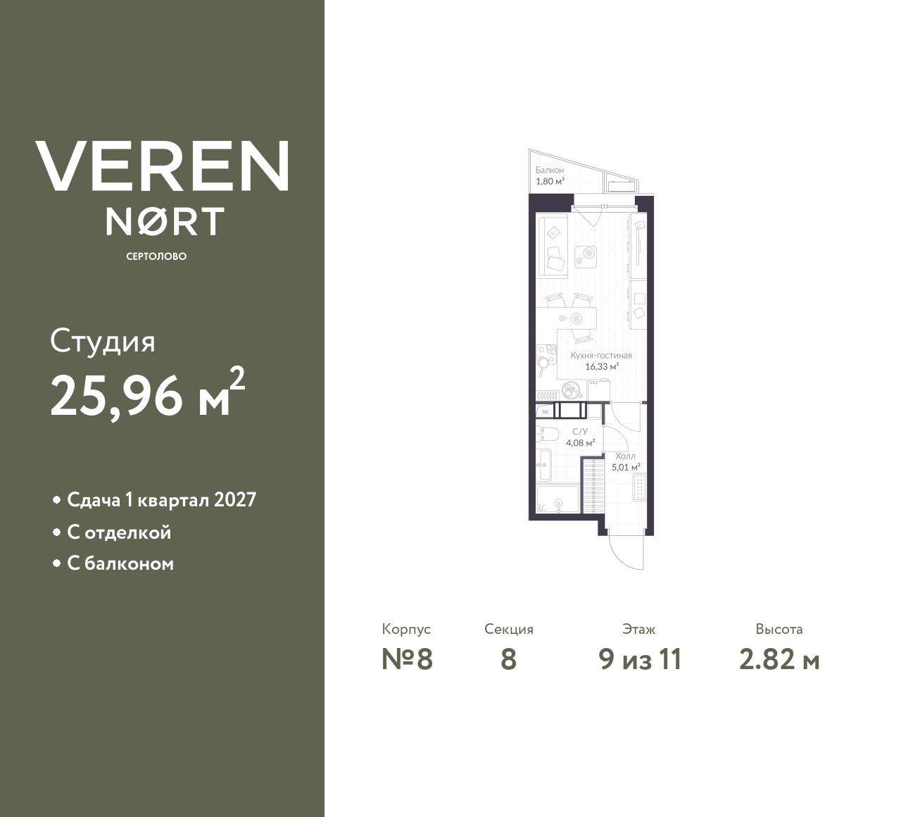 Успейте забронировать по акционной цене! Период предложения ограничен! Стоимость квартиры указана со скидкой, ваша экономия составит 570,830 RUB. Звоните, наши менеджеры вам все расскажут! Однокомнатная квартира-студия от застройщика с предчистовой отделкой в Veren Nort Сертолово на 9 этаже. Общая площадь: 25.96 кв.м., площадь гостиной 16.33 кв.м., из которых 5 кв.м. выделено под кухонную зону. Все окна выходят на одну сторону. В квартире один балкон, один совмещенный санузел. Высота потолков 2.82 м. Квартира находится в корпусе 8. Дом монолитный, одноподъездный, высотой 11 этажей. На этаже 14 квартир. В подъезде 1 пассажирский и 1 грузовой лифт. Окончание строительства - 4 квартал 2026 года. Оформление сделки по договору долевого участия. С балконом, с отделкой, вид на приватный двор. Сочетание современной архитектуры и отличной экологии севера Лен. области. Выразительный облик домов разработан именитым архитектурным бюро «Остоженка». Характеристики жилого комплекса исключительны: продуманный ландшафтный дизайн, оригинальные парадные, разработанные по индивидуальному дизайн-проекту, современные детские и многофункциональные спортивные площадки, летний кинотеатр под открытым небом, два детских сада. Комплекс создается в уже сложившейся инфраструктуре г. Сертолово и обладает удобным транспортным сообщением с Санкт-Петербургом. В 300 метрах от «VEREN NORT сертолово» планируется транспортно-пересадочный узел «Сертолово», который обеспечит удобную железнодорожную связь с Финляндским вокзалом Санкт-Петербурга. (AQID02417919)