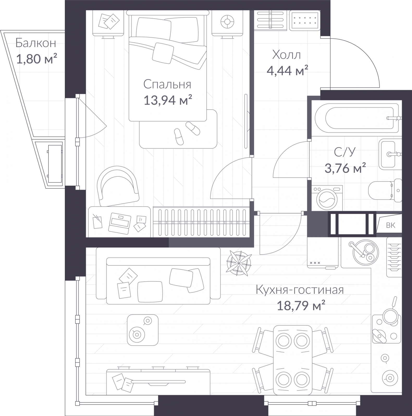 - Жилая площадь 13.94 м²